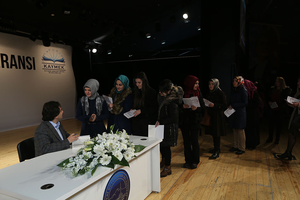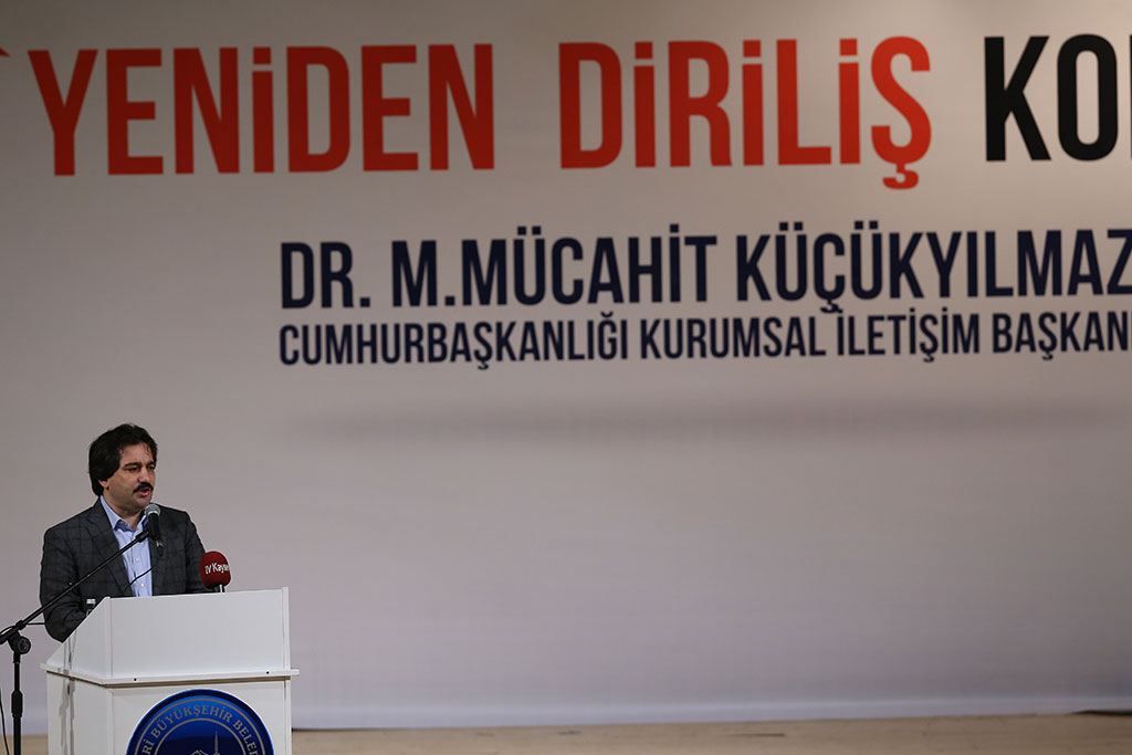 Büyükşehir Belediyesi 15 Temmuz ruhunu canlı tutan etkinliklere devam ediyor. Büyükşehir Belediyesi bünyesindeki KAYMEK tarafından “15 Temmuz Yeniden Diriliş” konulu bir konferans düzenlendi. Konferansa konuşmacı olarak Cumhurbaşkanlığı Kurumsal İletişim Başkanı Mücahit Küçükyılmaz katıldı. Kadir Has Kültür ve Sanat Merkezi’nde düzenlenen ve büyük ilgi gören konferansta 15 Temmuz gecesi bu milletin bir destana imza attığını belirten Cumhurbaşkanlığı Kurumsal İletişim Başkanı Mücahit Küçükyılmaz, “O gece yazılan destanın en büyük imzalarından birisi gençlerin imzasıdır. Jandarmanın ateşi altında külliyeye girmeye çalışırken yanımda 100 kadar genç vardı ve hepsi şehit olmaya hazırdı. Gençler o gece hiçbir cepheyi boş bırakmadılar” dedi. Türk milletinin farklı bir millet olduğunu da belirterek milletimizin bazı özelliklerine dikkat çeken Küçükyılmaz, sözlerini şöyle sürdürdü: “Bu millet en başta ölümden korkmayan bir millettir. Bir millet sadece zekası veya kas gücüyle güçlü değildir. Bir milleti güçlü kılan en önemli özellik ölümden korkmamaktır. İşte buna bir de iman ve şuur eklendiği zaman 15 Temmuz gecesi bu millete darbe yapmaya kalkan hainlerin ve onların efendilerinin hevesi kursağında kalır.” Konferans sonrası Büyükşehir Belediyesi Genel Sekreteri Hüseyin Beyhan, Cumhurbaşkanlığı Kurumsal İletişim Başkanı Mücahit Küçükyılmaz’a çiçek vererek teşekkür etti. Mücahit Küçükyılmaz daha sonra “Şeyh ile Hükümdar” adlı kitabını imzaladı.