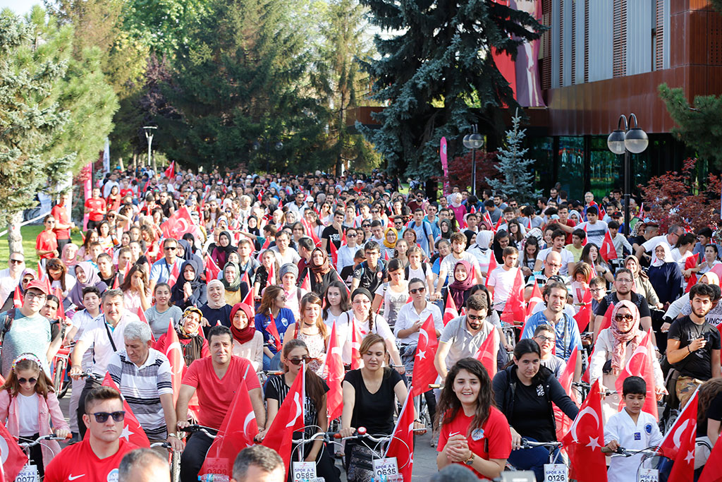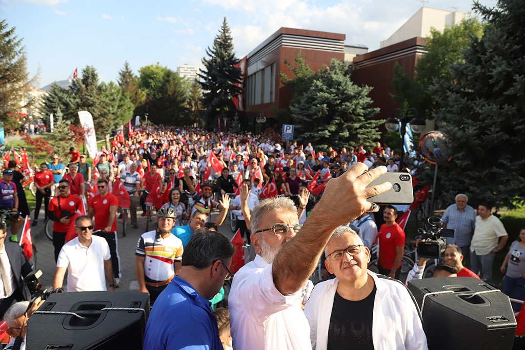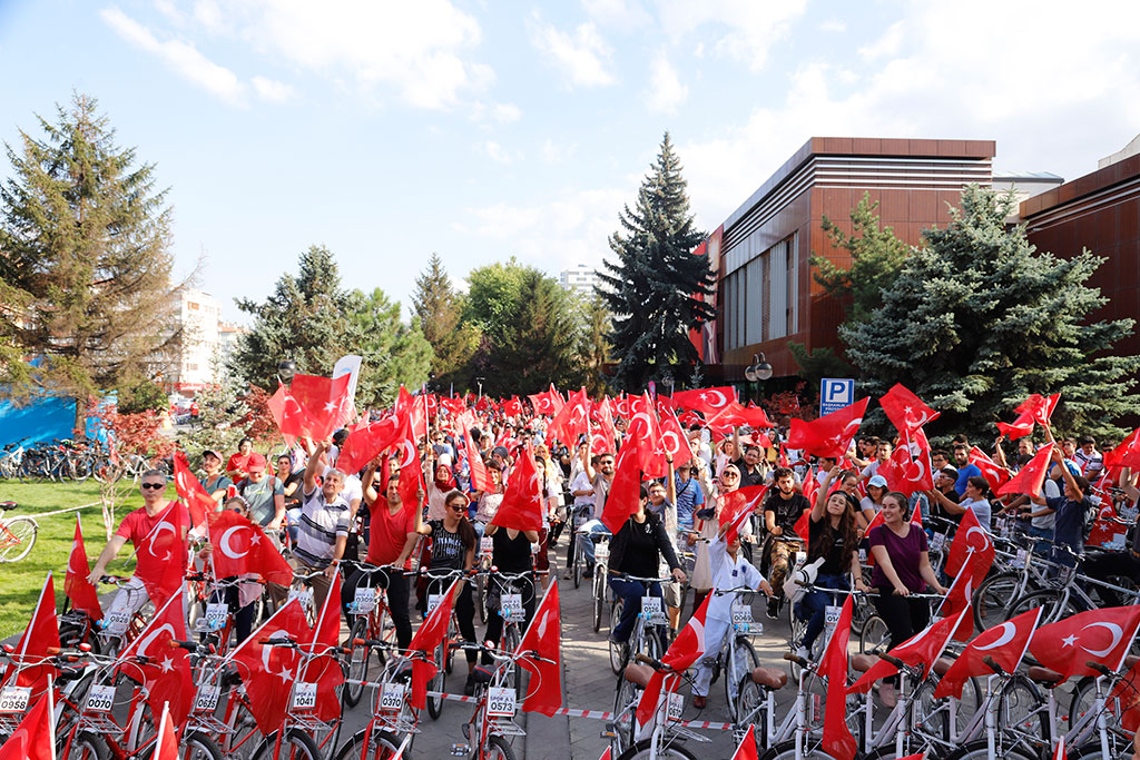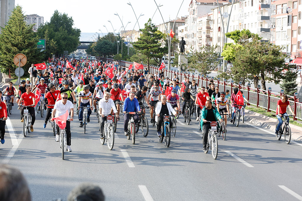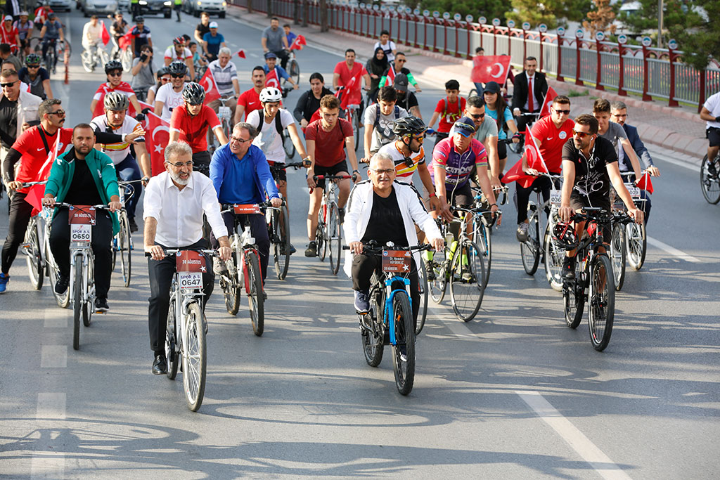 Kayseri Büyükşehir Belediyesi 30 Ağustos Zafer Bayramı etkinliklerine binlerce kişinin iştirakiyle gerçekleştirilen bisiklet turu ile katıldı. Büyükşehir Belediye Başkanı Dr. Memduh Büyükkılıç, 10 kilometrelik bisiklet turuna Önceki Dönem Enerji ve Tabi Kaynaklar Bakanı Taner Yıldız ile birlikte katıldı. 30 Ağustos Zaferinin yıl dönümü nedeniyle Büyükşehir Belediyesi Spor A.Ş. tarafından gerçekleştirilen Bisiklet Turu, Büyükşehir Belediyesi önünden başladı. Etkinliğe, ellerindeki Türk Bayraklarıyla binlerce kişi katıldı. Büyükşehir Belediyesi önünde katılımcılara seslenen Başkan Memduh Büyükkılıç, Spor A.Ş.’ye 30 Ağustos Zaferinin yıldönümünde böyle güzel bir organizasyon yaptığı için teşekkür etti. Katılımcıların Zafer Bayramını kutlayan Başkan Büyükkılıç, “Cenabı Allah Ay Yıldızlı Türk Bayrağımızı elimizden almasın. Vatanına, milletine, devletine, dinine sahip çıkan nesiller olarak yaşamamızı sağlasın” diye konuştu. Önceki dönem Enerji ve Tabi Kaynaklar Bakanı Taner Yıldız da konuşmasında Başkan Büyükkılıç’a böyle güzel bir organizasyon nedeniyle Kayseri halkı adına teşekkür ederek katılımcıların Zafer Bayramını tebrik etti. Konuşmaların ardından katılımcılarla birlikte Bakan Taner Yıldız tarafından öz çekim yapıldı ve startın verilmesiyle Zafer Turu başladı. Bisiklet turuna Taner Yıldız ve Başkan Büyükkılıç’ın yanı sıra Hacılar Belediye Başkanı Bilal Özdoğan, bürokratlar ve binlerce Kayserili katıldı. Ellerindeki Türk Bayrakları ile bisiklet turuna katılan binlerce Kayserili, 30 Ağustos Zaferi’ne muhteşem bir görüntü sundu. Zafer marşları eşliğinde yapılan 10 kilometrelik bisiklet turu Anadolu Harikalar Diyarı Spor Tesisleri önünde sona erdi.