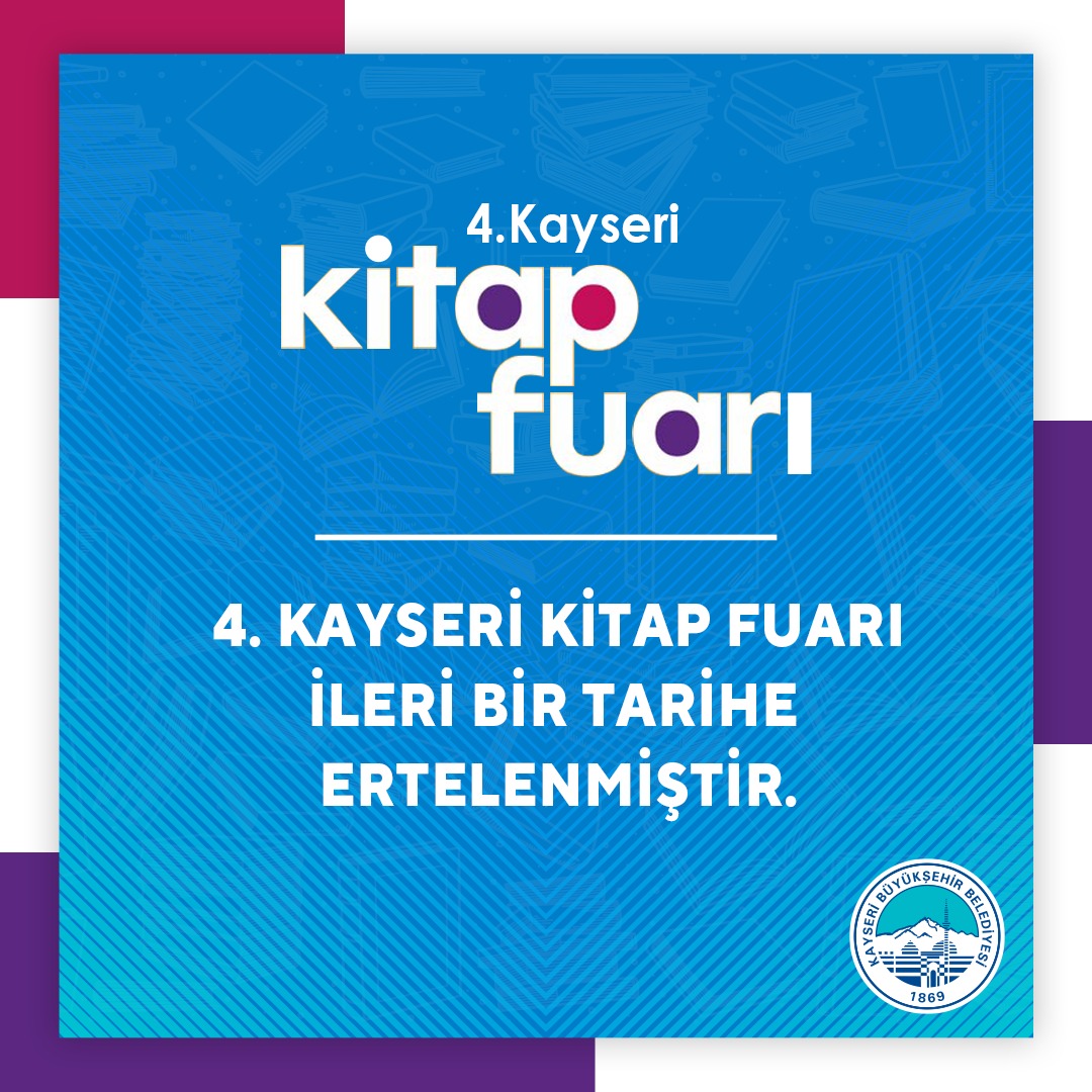 Kayseri Büyükşehir Belediyesi, 4. Kayseri Kitap Fuarı’nın ileri bir tarihe ertelendiğini açıkladı.Belediyeden yapılan açıklamada, 4. Kayseri Kitap Fuarı’nın 08 Ekim-17 Ekim tarihleri arasında yapılmasının planlandığı hatırlatıldı.