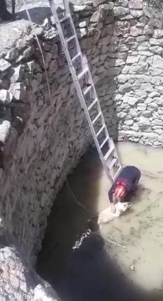 Su dolu kuyuda kalan köpeğin korkmaması için itfaiye