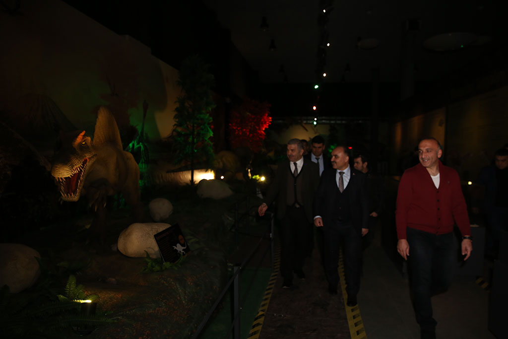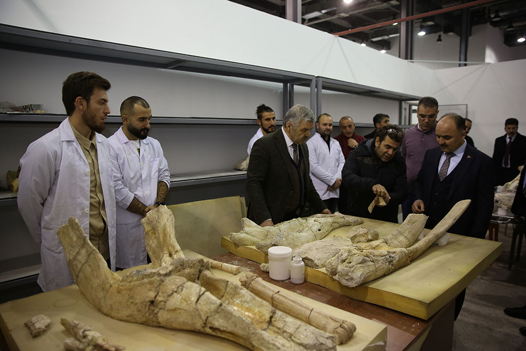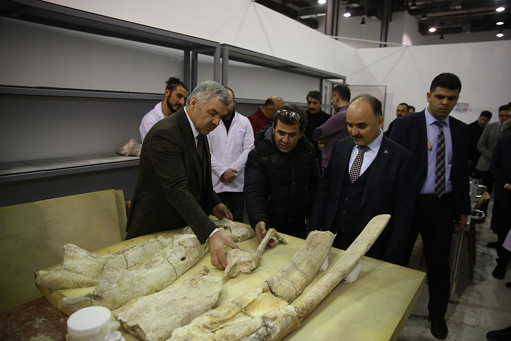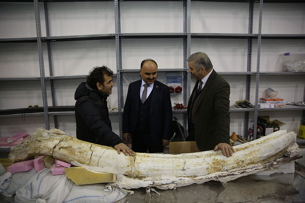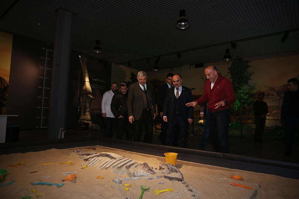 Kayseri Büyükşehir Belediyesi’nin desteklediği kazılarla Taşhan bölgesinde bulunan 7,5 milyon yıllık fosillerin güçlendirilmesi ve sergiye hazır hale getirilmesi için yapılan çalışmalar sürüyor. Büyükşehir Belediye Başkanı Mustafa Çelik, Kayseri Bilim Merkezi’ndeki fosillerle ilgili çalışmaları Vali Şehmus Günaydın ile birlikte takip etti. Başkan Çelik, dünyada örneği olmayan fosillerin en kısa sürede sergilenmeye başlayacağını kaydetti. Vali Şehmus Günaydın, Büyükşehir Belediyesi ve TÜBİTAK tarafından şehrimize kazandırılan Kayseri Bilim Merkezi’ni Büyükşehir Belediye Başkanı Mustafa Çelik ile birlikte gezdi. Başkan Çelik, Vali Günaydın ile birlikte Türkiye’nin en büyük gökevi olan planetaryumda bilimsel film izledi. Vali Günaydın ve Başkan Çelik, Bilim Merkezi’ndeki atölye çalışmalarına katılan çocukları da ziyaret etti. Bilim Merkezi’ndeki sergi alanlarını gezen Vali Şehmus Günaydın’a Kayseri Bilim Merkezi Müdürü Suat Şahin bilgi verdi. Bilim Merkezi’ndeki Devr-i Dinozor sergisini de gezen Vali Günaydın ve Başkan Çelik, daha sonra Bilim Merkezi’nde 7,5 milyon yıllık fosiller için oluşturulan laboratuvarı ziyaret etti. “ŞEHRİMİZE DEĞER KATAN BULUNTULAR” Büyükşehir Belediyesi’nin desteklediği kazılarla Taşhan bölgesinde bulunan 7,5 milyon yıllık fosillerle ilgili yapılan çalışmalar hakkında Hacı Bektaş Veli Üniversitesi Güzel Sanatlar Fakültesi Dekanı Prof. Dr. Cesur Pehlevan bilgi verdi. Yaklaşık 4 ay önce kazı çalışmalarına başladıklarını ifade eden Pehlevan, “Bu önemli buluntuların teşhiriyle ilgili çalışmaları sürdürüyoruz. Büyükşehir Belediye Başkanımıza verdiği destekler nedeniyle teşekkür ediyoruz. Verdiği destekler sayesinde bu noktalara geldik” dedi. Büyükşehir Belediye Başkanı Mustafa Çelik de Kayseri’nin zenginlikler şehri olduğunu dile getirdi ve 7,5 milyon yıllık fosillerin de bu zenginliklerin örneği olduğunu söyledi. Eskiye dair izlerin ortaya çıkarılmasının önemine işaret eden Başkan Çelik, “Kültepe’de 6 bin yıl öncesine ait objeler çıkarıyoruz. Yamula Barajı kenarında Taşhan bölgesinde de 7-75 milyon yıl eskiye dair yaşam izlerini ortaya çıkardık. Dünyada eşi benzeri olmayan, günümüz fillerinin atası sayılabilecek bir file ait alt çene dişlerinin örneği yok. Bunun dışında farklı objeler de çıkarılıyor. Şehrimize değer katan buluntuları inşallah kısa süre içinde sergilemeye başlayacağız” diye konuştu. Vali Şehmus Günaydın da, destekleri nedeniyle Büyükşehir Belediyesi’ne çalışmaları nedeniyle de kazı heyetine teşekkür etti. Bu önemli eserleri turizme kazandırmak gerektiğini ifade eden Vali Günaydın, “İlimize daha çok turistin gelmesi için fosil müzesi, ticaret müzesi gibi müzeler açmamız lazım. Bu konuda belediyemizin çalışmaları da var. Bu çalışmalara büyük katkı veren Büyükşehir Belediye Başkanımıza teşekkür ediyorum” şeklinde konuştu.