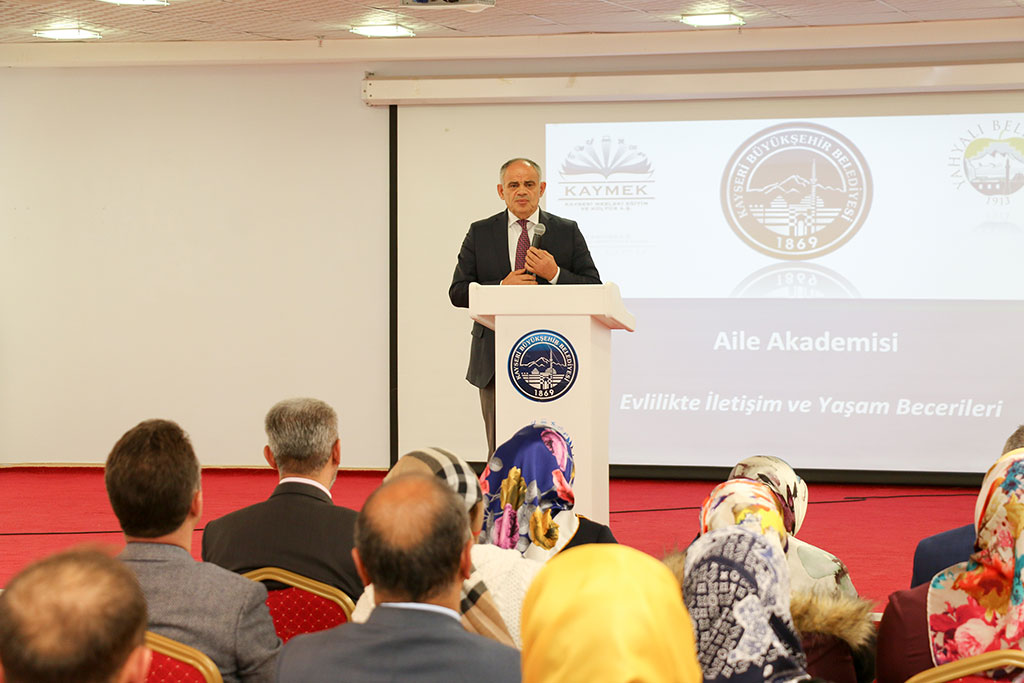 Büyükşehir Belediyesi KAYMEK bünyesindeki Huzur Çınarı Aile Danışmanlık Merkezi ailelerin daha sağlıklı olması için kent merkezinin yanı sıra ilçelerde de çalışmalarına devam ediyor. Ailelerin bilinçlenmesi amacıyla ilçeler için oluşturulan Aile Akademisi, ilk olarak Yahyalı Kadın ve Gençlik Merkezi’nde çalışmalarına başladı. Büyükşehir Belediyesi’nin huzur veren birimlerinden KAYMEK bünyesindeki Huzur Çınarı Aile Danışmanlık ve Rehberlik Merkezi, kent merkezinden sonra ilçelerde de Aile Akademisi açmaya başladı. Aile Akademisi’nin Yahyalı’da başlayan çalışmalarına Yahyalı Belediye Başkanı Esat Öztürk de katıldı. Yahyalı Kadın ve Gençlik Merkezi’nde düzenlenen ‘Aile içi iletişim’ seminerinde bir konuşma yapan Öztürk, ailelerin huzuru için gerçekleştirilen çalışmaların ilçelere de taşınması nedeniyle Büyükşehir Belediye Başkanı Mustafa Çelik’e teşekkür etti. İletişimin önemini vurgulayan Öztürk, aile bireylerinin birbirlerine saygı duyması gerektiğini kaydetti. Yahyalı Belediye Başkanı Esat Öztürk’ün yanı sıra İlçe Emniyet Müdürü, İlçe Milli Eğitim Müdürü, İlçe Müftüsü gibi yöneticilerin de eşleri ile katıldığı Aile Akademisi eğitiminde Huzur Çınarı Aile Danışmanlarınca aile içi iletişimin nasıl kurulacağına ilişkin bilgiler verildi. Eğitimde eşlerin birbirlerini ne kadar tanıdıklarını ölçmeye yönelik testler de yapıldı. Aile Eğitim Seminerinin sonunda katılımcılara belge takdim edildi.
