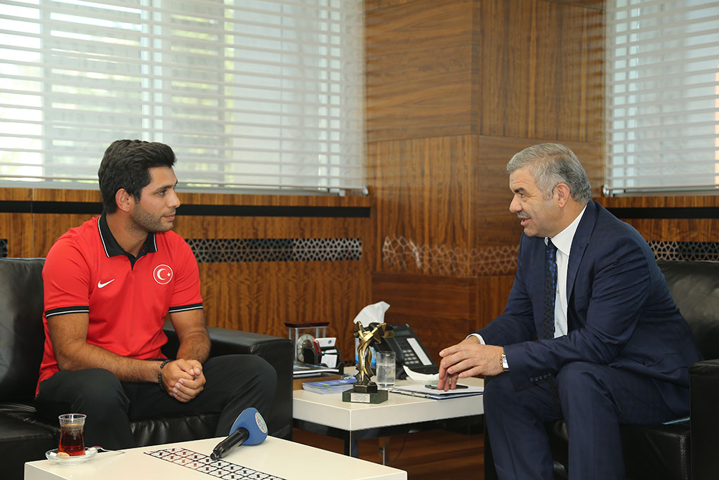 Ulusal ve uluslararası müsabakalarda şehrimizi başarıyla temsil eden Milli Okçumuz Demir Elmaağaçlı, Büyükşehir Belediye Başkanı Mustafa Çelik’i ziyaret etti. Samsun’da yapılan dünya kupasında bir altın bir gümüş madalya kazanan Elmaağaçlı, Başkan Çelik’e okçuluğa verdiği destek için teşekkür etti ve elde edilen başarıların verilen destekler sayesinde geldiğini kaydetti. Samsun’da düzenlenen Dünya Okçuluk Şampiyonası’nda Makaralı Yay Karışık Takım’da Altın Madalya, Makaralı Yay Erkeklerde Gümüş Madalya kazanan Milli Okçumuz Demir Elmaağaçlı, Büyükşehir Belediye Başkanı Mustafa Çelik’i ziyaret ederek destekleri nedeniyle teşekkür etti. Ülkemizi ve şehrimizi başarıyla temsil eden Demir Elmaağaçlı, verilen destekler sayesinde başarının geldiğini ifade ederek, “Sayın Başkanım emekleriniz zayi etmiyoruz. Güzel derecelerle memleketimize geliyoruz. Dünyanın en iyi takım ve sporcularının katıldığı Samsun’daki Dünya Kupası Finalleri’nde ülkemizi kardeşimle birlikte temsil ettim. Takımlarda Avrupa rekoru kırarak altın madalya kazandık. Bireysel atışlarda da dünya ikinciliğini getirdim. Çok mutluyum. Sizlerin bizlere inancınız sayesinde bu başarıları getiriyoruz. Destekleriniz için teşekkür ederim” dedi. Büyükşehir Belediye Başkanı Mustafa Çelik de, Demir Elmaağaçlı’yı başarısından dolayı tebrik ederek, “Bizim istediğimiz ve arzu ettiğimiz görüntü bu. Amacımız, spor okullarındaki kabiliyetli gençlerimizi spor kulüplerimizde değerlendirerek tüm dünyada uluslararası çapta başarılı olmalarını sağlamaktı. Bunun en güzel örneği Demir Elmaağaçlı ve kardeşi. Gittikleri şampiyonalarından başarıyla dönüyorlar. Tebrik ediyor başarılılarınızın devamını diliyorum” diye konuştu.