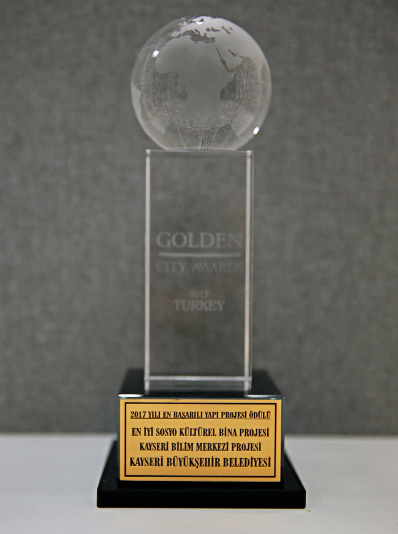 Büyükşehir Belediyesi yaptığı hizmet ve yatırımlarla ödüller almaya devam ediyor. Büyükşehir Belediyesinin Aralık 2016’da hizmete açtığı Anadolu’nun yeni cazibe merkezi olan Bilim Merkezi, “Golden City Awards 2017” ödülüne layık görüldü. Altın Kentler Platformu tarafından düzenlenen, sektörün en prestijli ödüllerinin verildiği Altın Şehir Ödülleri (Golden City Awards 2017) Töreni İstanbul’da yapıldı. Bu yıl 'Yerel Yönetimlerde, Vizyon Proje Ve Hizmetler' temasıyla düzenlenen törende Kayseri Büyükşehir Belediyesi ödüle layık görüldü. Kayseri Bilim Merkezi 2017 yılının en başarılı yapı projesi ödülünü aldı. Kayseri Büyükşehir Belediyesi’nin ödüllü projeleri Kayseri’ye kazandırmaya devam ettiğini belirten Büyükşehir Belediye Başkanı Mustafa Çelik, kısa süre önce Keykubat Kent Park projesiyle alınan ödülün ardından Kayseri Bilim Merkezi binasının da ödüle layık görüldüğünü söyledi. Başkan Çelik, “Planlı Gelişim, Estetik Dönüşüm, Fonksiyonel Değişim” vizyonu doğrultusunda kent merkezi ve ilçelerimize prestijli ve fonksiyonel tesisler kazandırmaya devam ettiklerini vurguladı.