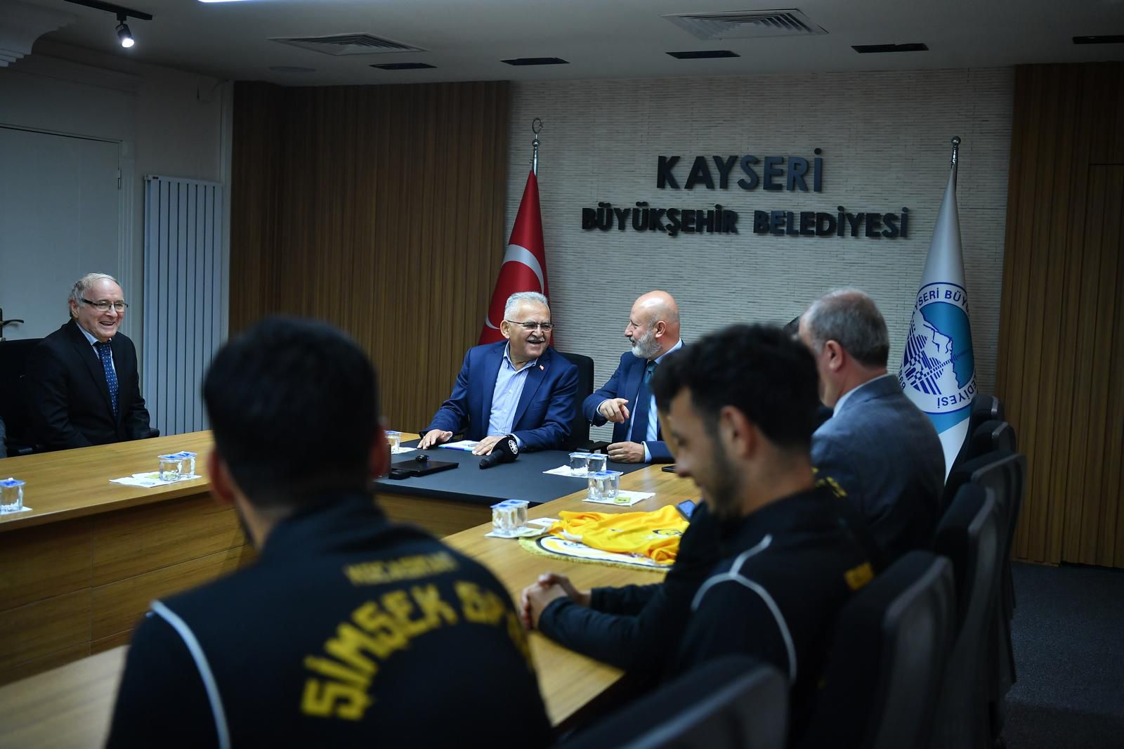 Başkanlık toplantı salonunda gerçekleşen ziyarette konuşan Başkan Büyükkılıç, “Bir bakıma futbolcu fabrikası olarak nitelendirilen Kocasinan Şimşekspor’un Kocasinan Belediyesi’nin ağabeyliğinde yol almasını önemsiyoruz” dedi.