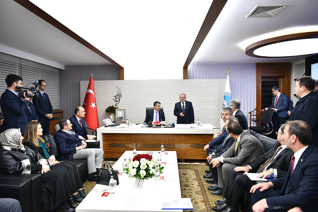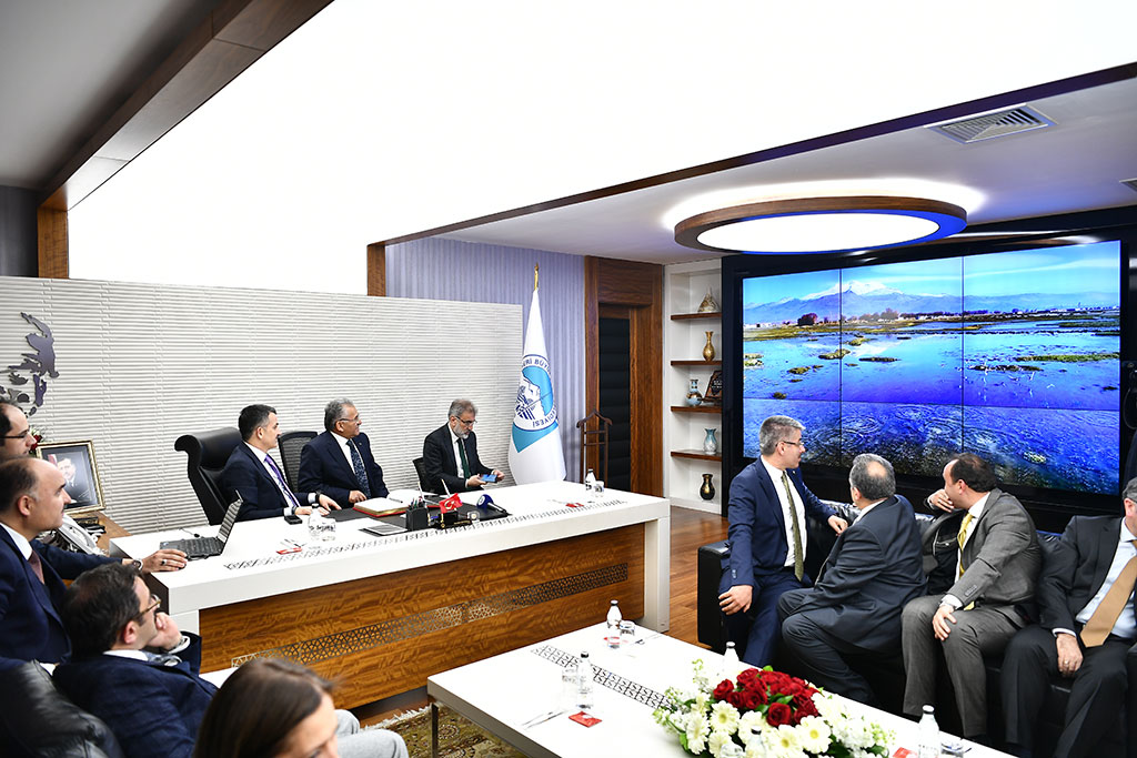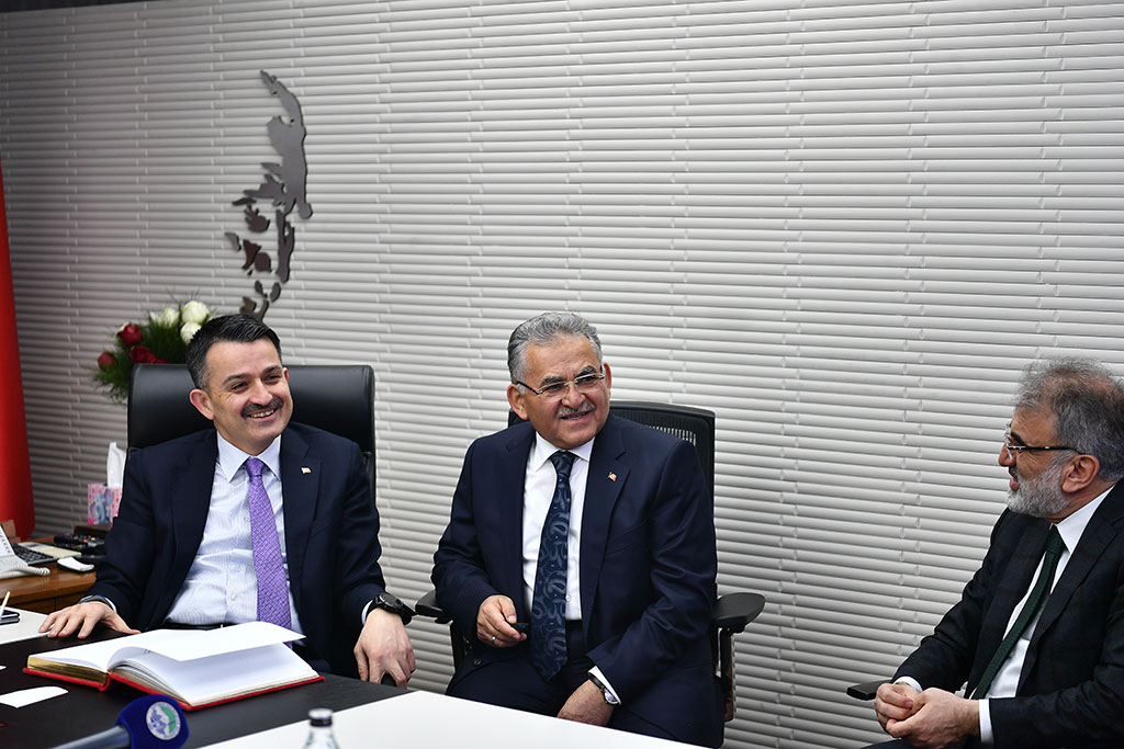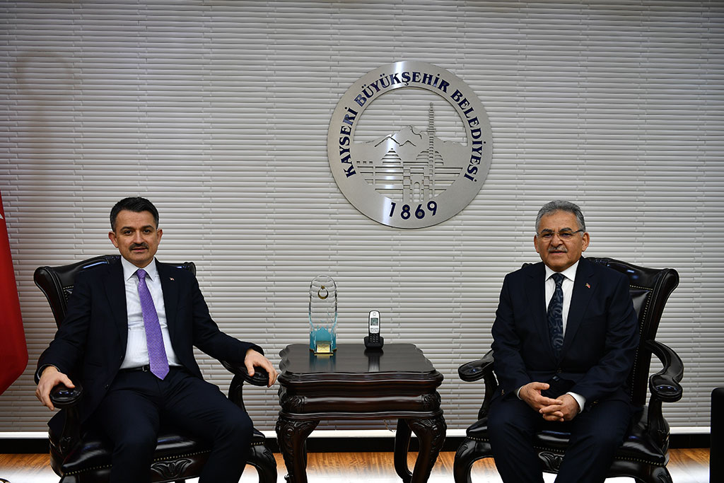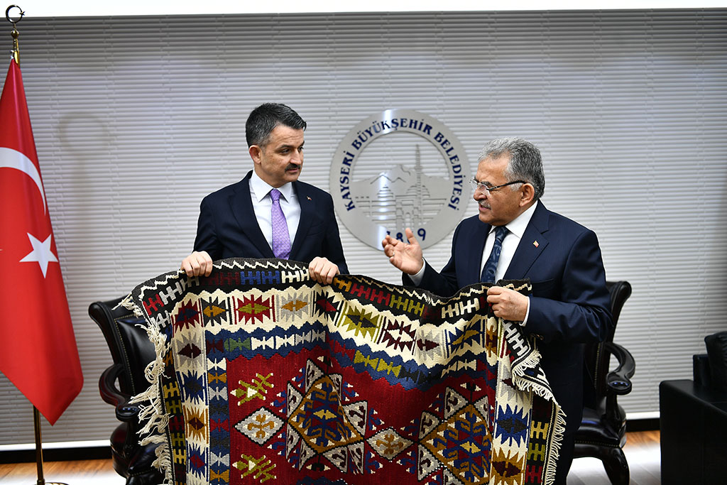Tarım ve Orman Bakanı Bekir Pakdemirli, Büyükşehir Belediye Başkanı Dr. Memduh Büyükkılıç’ı ziyaret etti. Başkan Büyükkılıç, ziyarette zenginlikler şehri Kayseri ile ilgili Bakan Pakdemirli’ye bilgi aktardı ve Kayseri’nin Bakanlığın da desteği ile tarım ve hayvancılıkta çok daha hızlı gelişebileceğini kaydetti. Büyükşehir Belediye Başkanı Dr. Memduh Büyükkılıç, Tarım ve Orman Bakanı Bekir Pakdemirli’yi Başkanlık girişinde karşıladı. Bakan Pakdemirli’nin Büyükşehir Belediyesi’ni ziyaretine Vali Şehmus Günaydın, Önceki Dönem Enerji ve Tabii Kaynaklar Bakanı Taner Yıldız, Kayseri Milletvekili Hülya Nergis, AK Parti İl Başkanı Şaban Çopuroğlu, ilçe belediye başkanları ve bürokratlar da katıldı. Başkan Memduh Büyükkılıç, Bakan Bekir Pakdemirli’ye ziyaretinin anısına kök boyadan yapılmış el dokuması kilim hediye etti. Kayseri’nin tarım ve hayvancılıktaki yeri ile ilgili bilgi veren Başkan Memduh Büyükkılıç, Tarım ve Orman Bakanlığı’nın desteğiyle çok daha ileri noktalara taşınabileceğini dile getirdi. Ziyarette Tarım ve Orman Bakanı Bekir Pakdemirli’ye “Zenginlikler Şehri Kayseri” filmi de izletildi. Başkan Büyükkılıç, Kayseri’yi anlatan filmle birlikte şehir ve ilçeleriyle ilgili ayrıntılı bilgiler aktardı.
