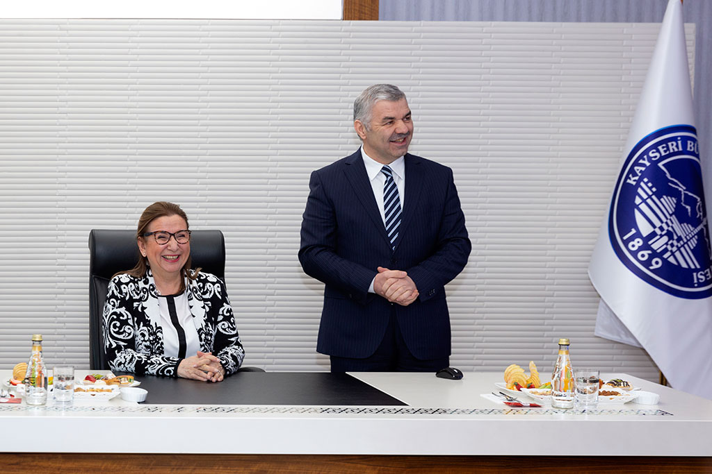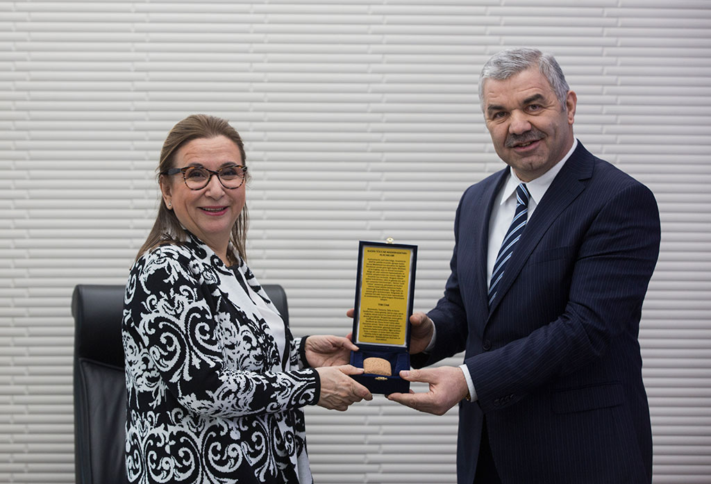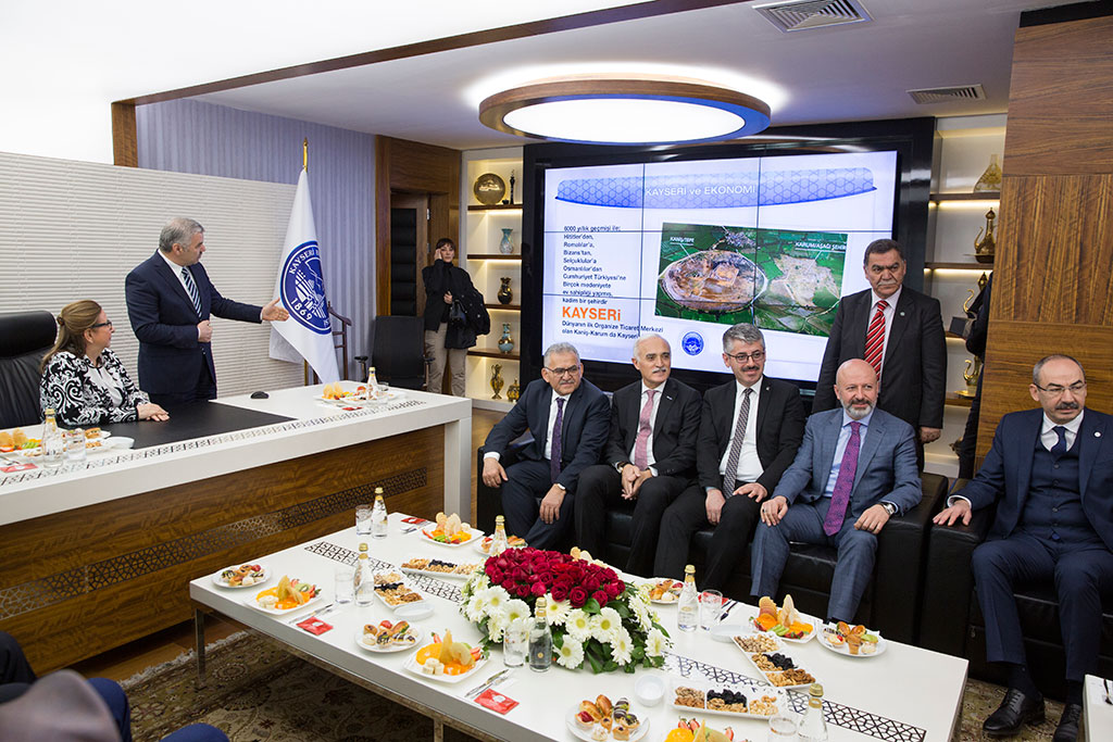 Ticaret Bakanı Ruhsar Pekcan, Büyükşehir Belediye Başkanı Mustafa Çelik’i ziyaret etti. Başkan Çelik, Bakan Pekcan’a Kayseri ekonomisini büyütmek için yaptıkları projeler hakkında bilgi verdi. Başkan Çelik ayrıca Ticaret Bakanı Pekcan’a ticaretin ilk belgelerinden olan ve Kültepe’den çıkarılan 6 bin yıllık kil tabletin replikasını hediye etti. Büyükşehir Belediye Başkanı Mustafa Çelik, Ticaret Bakanı Ruhsar Pekcan’ı Başkanlık girişinde karşıladı. Bakan Pekcan’ın ziyaretine Vali Şehmus Günaydın, Kayseri Milletvekili Hülya Nergis, TOBB Başkanı Rıfat Hisarcıklıoğlu, TESK Başkanı Bendevi Palandöken, DEİK Başkanı Nail Olpak, AK Parti İl Başkanı Şaban Çopuroğlu, Melikgazi Belediye Başkanı Memduh Büyükkılıç, Kocasinan Belediye Başkanı Ahmet Çolakbayrakdar ve oda başkanları katıldı. Ziyarette Başkan Mustafa Çelik, Kayseri ile ilgili bir sunum yaptı. Kayseri’nin tarihi ve bugünü hakkında bilgiler veren Başkan Çelik, Büyükşehir yatırımları, ilçelere ekonomik destek paketleri, esnafa verilen katkılar, ekonomiyi büyütecek projeler, Kayseri’nin tanıtılmasına yönelik çalışmalarla ilgili açıklamalarda bulundu. Ziyarette ayrıca Başkan Mustafa Çelik, Ticaret Bakanı Ruhsar Pekcan’a dikkat çekici bir hediye takdim etti. Kültepe’deki kazı çalışmalarında çıkarılan kil tabletin replikasını Bakan Pekcan’a veren Başkan Mustafa Çelik, tabletin 6 bin yıl önce bir kadın tüccar olan Madawada’nın yapmış olduğu alacak senedi olduğunu söyledi. Ticaret Bakanı Pekcan da ticaretin ilk belgelerinden olan tableti ilgiyle inceledi.