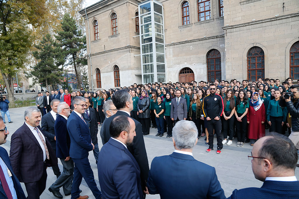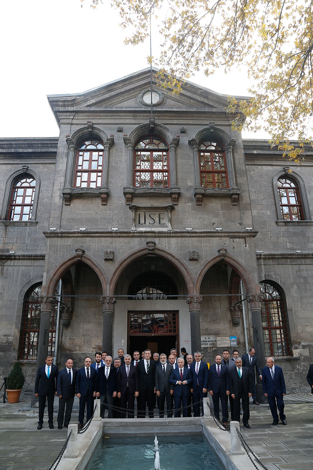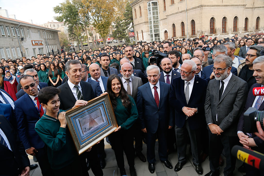 Milli Eğitim Bakanı Ziya Selçuk, Kayseri Lisesi Milli Mücadele Müzesi’ne ve müzenin yer aldığı Tarihi Kayseri Lisesi binasına hayran kaldı. Büyükşehir Belediye Başkanı Mustafa Çelik, Bakan Selçuk’a müzeyle ilgili bilgiler verdi. Milli Eğitim Bakanı Ziya Selçuk, Kayseri Lisesi Milli Mücadele Müzesi’ne Büyükşehir Belediye Başkanı Mustafa Çelik’in yanı sıra Vali Süleyman Kamçı, AK Parti Kayseri Milletvekilleri Mustafa Elitaş, Taner Yıldız ve İsmail Emrah Karayel, AK Parti İl Başkanı Şaban Çopuroğlu ve bürokratlarla birlikte geldi. Taş Mektep olarak da bilinen Tarihi Kayseri Lisesi binasından çok etkilenen Bakan Selçuk, daha sonra müzeyi gezdi. Bakan Selçuk’a müzeyle ilgili bilgiler verildi. Milli Mücadele Müzesi’ni çok beğenen Bakan Ziya Selçuk beraberindekilerle ilk meclisi simgeleyen kürsüde poz verdi. Büyükşehir Belediye Başkanı Mustafa Çelik, Milli Eğitim Bakanı Selçuk’a müzede yapılan eğitim çalışmalarından da bahsetti. Bu kapsamda çocuklara verilen atölye çalışmaları takip edildi. Çocuklarla yakından ilgilenen Bakan Selçuk, onlara çeşitli hediyeler verdi. Bakan Ziya Selçuk, müzenin eğitim müzesi kısmını da ziyaret etti ve örnek sınıfı gezdi. Başkan Mustafa Çelik, eğitim müzesi bölümünde yer alan eşyalar hakkında bilgiler verdi. KAYSERİ LİSESİ’NDE ANLAMLI KARŞILAMA Milli Eğitim Bakanı Ziya Selçuk, Kayseri Lisesi Milli Mücadele Müzesi’ni gezdikten sonra Kayseri Lisesi’ni ziyaret etti. Bakan Selçuk, öğrenciler tarafından Kayseri Lisesi marşıyla karşılandı. Kayseri Lisesi Marşı’nı dinleyen Bakan Selçuk, öğrencilerle bir süre sohbet etti. Bakan Selçuk’a çiçek veren öğrenciler bir dönem tüm öğrencilerini şehit veren okulun mezun veremediğini anlatan tabloyu da takdim ettiler.