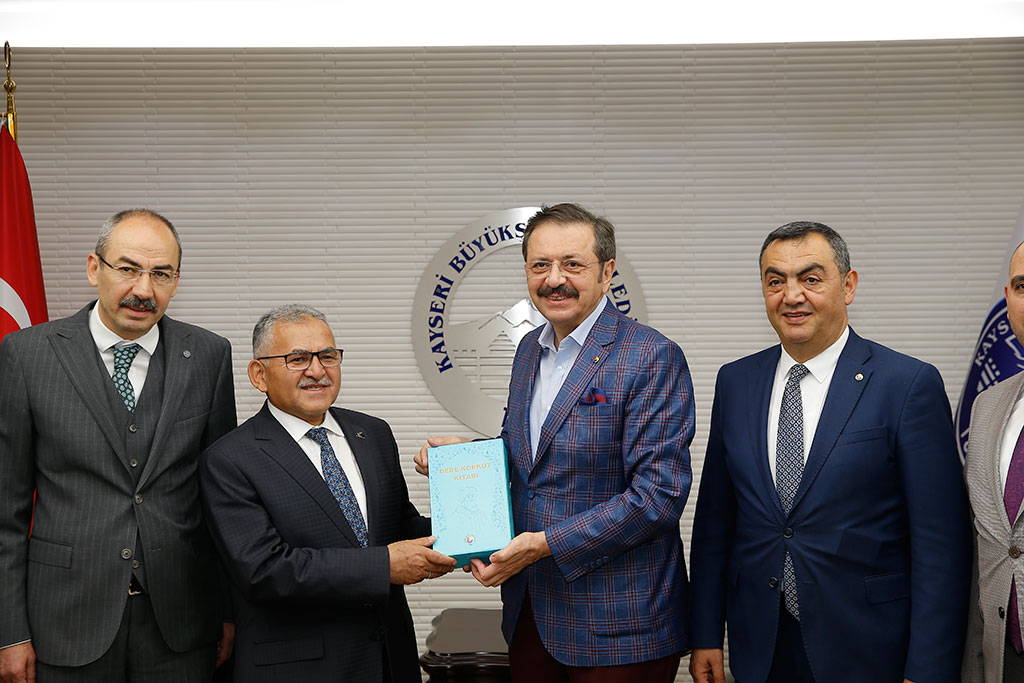 Türkiye Odalar ve Borsalar Birliği (TOBB) Başkanı Rıfat Hisarcıklıoğlu, Büyükşehir Belediye Başkanı Dr. Memduh Büyükkılıç’ı ziyaret etti. Hisarcıklıoğlu, Başkan Büyükkılıç’ın çok başarılı bir belediye başkanı olduğunu söyledi. TOBB Başkanı Rıfat Hisarcıklıoğlu’nun Büyükşehir Belediye Başkanı Memduh Büyükkılıç’ı ziyaretine Sanayi Odası Başkanı Mehmet Büyüksimitçi, Ticaret Odası Başkanı Ömer Gülsoy ve Ticaret Borsası Başkanı Recep Bağlamış da katıldı. Başkan Büyükkılıç, Rıfat Hisarcıklıoğlu’na KAYMEK’te yapılmış çini süslemeli tabak, Hisarcıklıoğlu da Başkan Büyükkılıç’a Dede Korkut’un kitap setini hediye etti. Başkan Büyükkılıç’a hayırlı olsun dileklerini ileten TOBB Başkanı Hisarcıklıoğlu, “Başkanımız, Melikgazi Belediye Başkanlığı döneminde çok başarılı bir belediye başkanı oldu. Kayseri halkı kadirşinastır. Büyükşehir Belediye Başkanlığına da rekor oyla getirdiler. Görevinde başarılar diliyorum ve başarılı olacağına da tüm kalbimle inanıyorum” dedi. Büyükşehir Belediye Başkanı Memduh Büyükkılıç da, Hisarcıklıoğlu’nun ülkemizin önemli isimlerinden olduğunu dile getirerek, “Dünyada ülkemizi başarıyla temsil ediyorsunuz. Rahmetli meslektaşım Emin Hisarcıklıoğlu ve Solmaz Teyzemizin de evladısınız ve Bizim için önemlisiniz” diye konuştu.