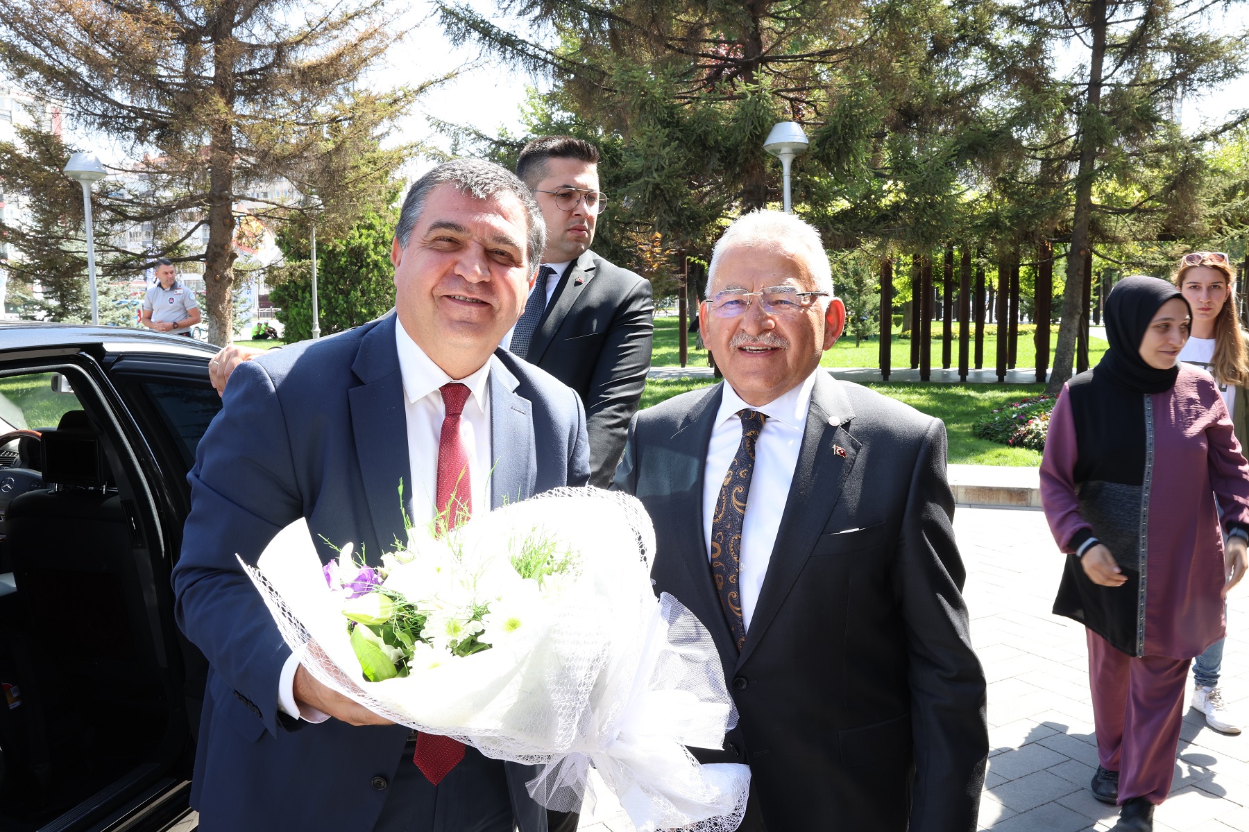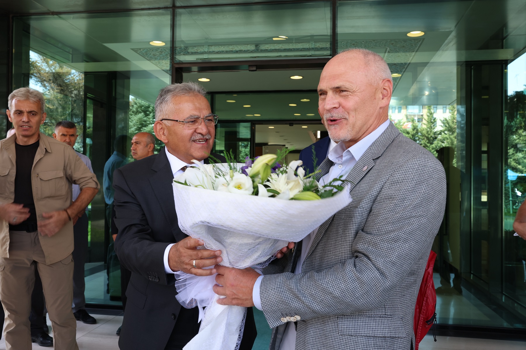 Başkan Büyükkılıç, çiçeklerle karşılanan misafirlerle bir