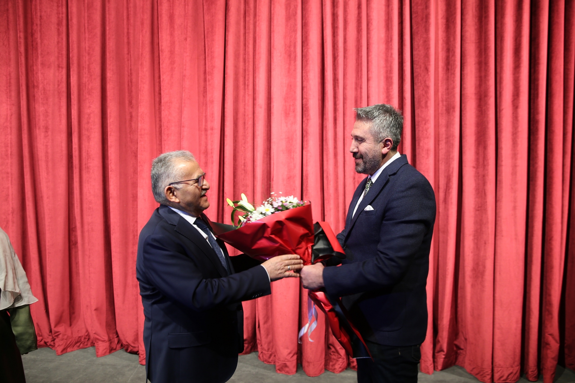 Başkan Büyükkılıç, oyunun yönetmeni Murat Özdeniz’e çiçek
