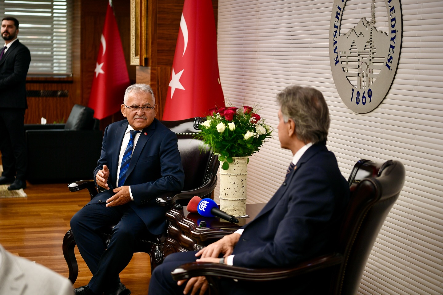 Büyükkılıç, başkanlık girişinde Demir’i çiçeklerle karşılarken, ikili karşılamanın ardından başkanlık makamına geçti.