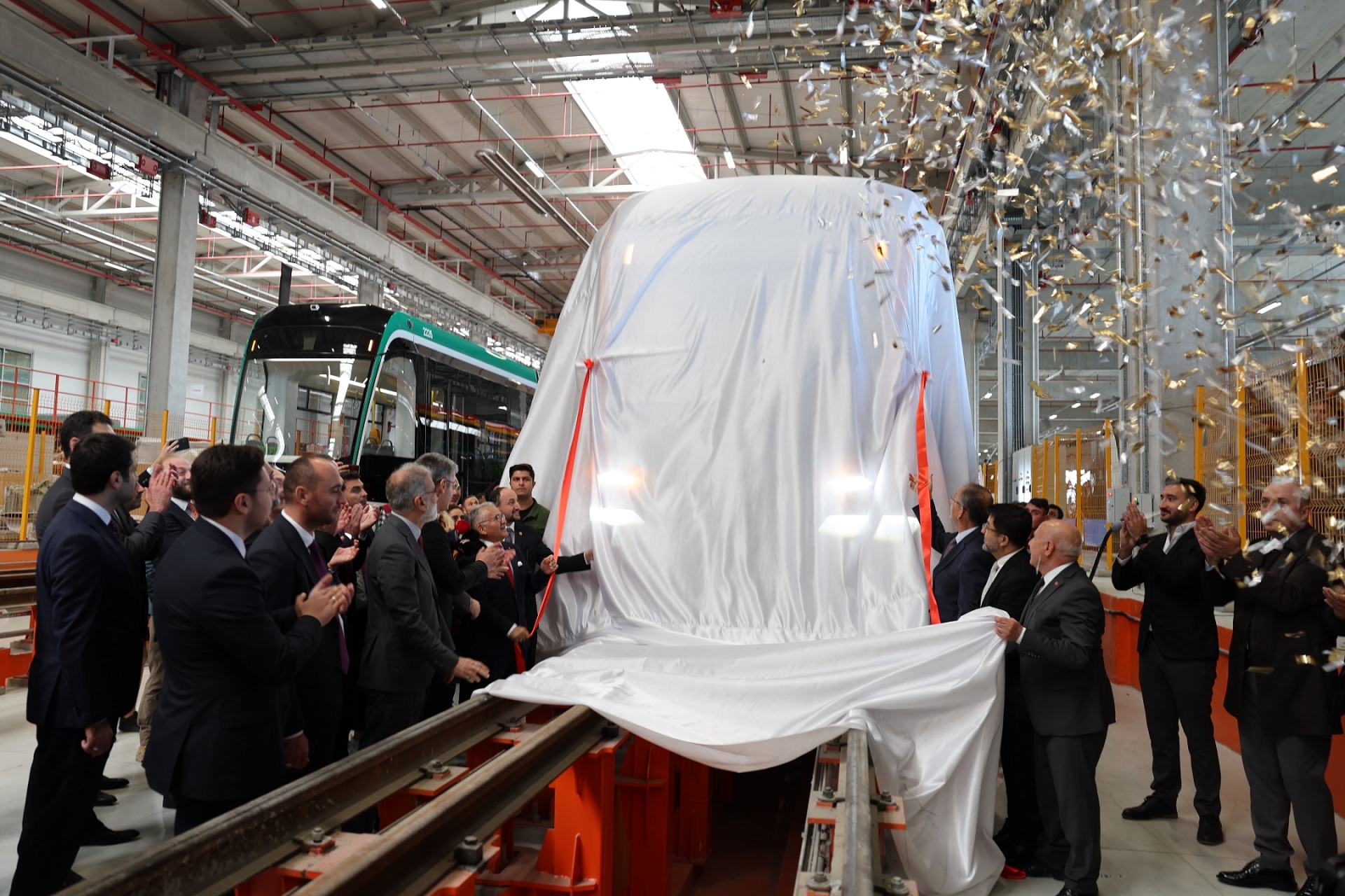 tramvay aracının örtüsü Bakan Karaismailoğlu, Başkan Büyükkılıç ve Özhaseki