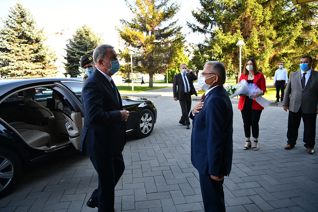 Milli Savunma Bakanı Hulusi Akar, beraberinde Genelkurmay Başkanı Yaşar Güler, Savunma Sanayii Başkanı Prof. Dr. İsmail Demir, Kara Kuvvetleri Komutanı Orgeneral Ümit Dündar, Deniz Kuvvetleri Komutanı Oramiral Adnan Özbal, Hava Kuvvetleri Komutanı Orgeneral Hasan Küçükakyüz ve Bakan Yardımcısı Muhsin Dere ile birlikte Büyükşehir Belediyesi’ni ziyaret ederek Başkan Dr. Memduh Büyükkılıç ile görüştü. Milli Savunma Bakanı Akar ve beraberindekiler Büyükşehir Belediyesi’ne gelişlerinde Başkan Büyükkılıç, Genel Sekreter Hüseyin Beyhan ve diğer üst düzey yöneticiler tarafından karşılandı. Başkanlık makamında Bakan Akar ve beraberindekileri ağırlayan Başkan Büyükkılıç, ziyaretten duyduğu memnuniyeti dile getirerek, Kayseri’de devam eden çalışmalar ve projeleri hakkında bilgiler verdi. Ziyarette, Kayseri Valisi Şehmus Günaydın ile Önceki Dönem Enerji ve Tabii Kaynaklar Bakanı Taner Yıldız da hazır bulundu.