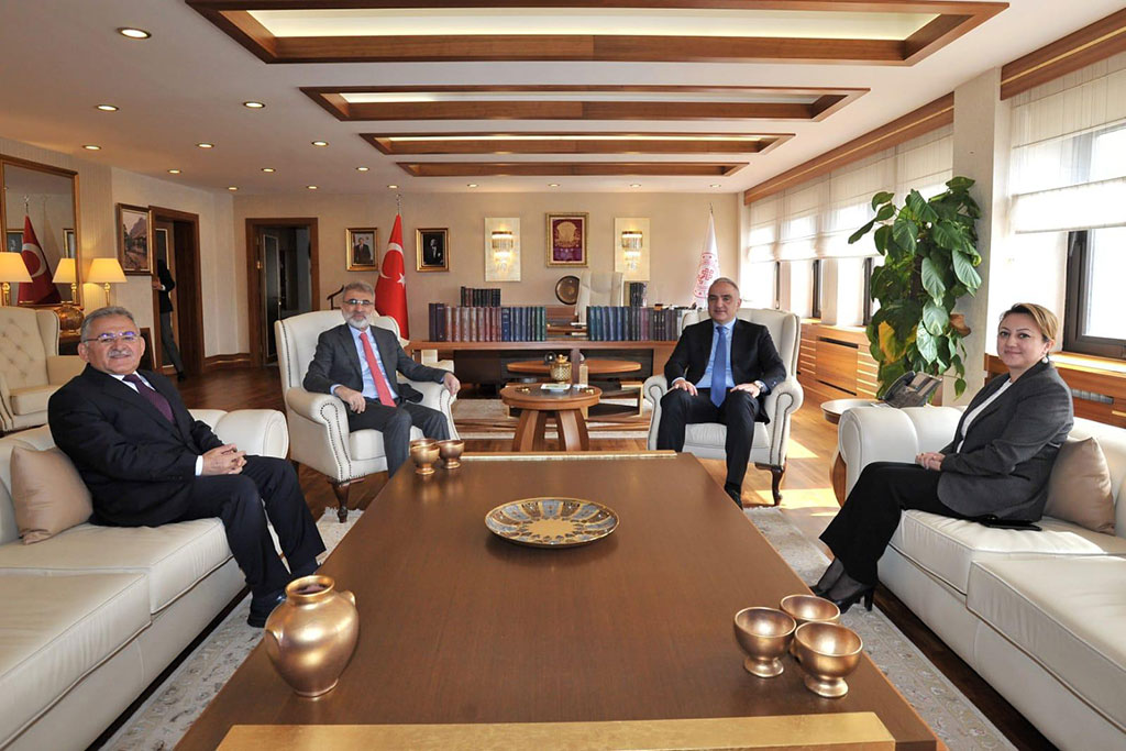 Kayseri Büyükşehir Belediye Başkanı Dr. Memduh Büyükkılıç, Kayseri’yi her yönüyle turizm şehri haline getirmek için Ankara nezdinde de çalışmalarını sürdürüyor. Başkan Memduh Büyükkılıç, bu kapsamda Kültür ve Turizm Bakanı Mehmet Nuri Ersoy’u ziyaret ederek Kayseri ile ilgili projeleri görüştü. Kayseri’yi turizm şehri yapmak için çalışmalarına hız kesmeden devam eden Büyükşehir Belediye Başkanı Dr. Memduh Büyükkılıç, bu kapsamdaki çalışmaları takip etmek üzere Ankara’ya gitti. Başkan Büyükkılıç, bürokratlarıyla birlikte Kültür ve Turizm Bakanı Mehmet Nuri Ersoy’u ziyaret etti. Ziyarete Önceki Dönem Enerji ve Tabii Kaynaklar Bakanı Taner Yıldız da katıldı. Büyükşehir Belediye Başkanı Büyükkılıç, ziyarette Kayseri’de turizmi geliştirmek amacıyla yaptıkları çalışmalarla ilgili Bakan Ersoy’a bilgi verdi. Kayseri’deki kültürel mirası canlı tutmak ve kültür hayatı ile turizmi geliştirmek için çalışmalara ara vermeden devam ettiklerini dile getiren Başkan Büyükkılıç, Kültür ve Turizm Bakanlığı’ndan bu çalışmalara destek istedi.