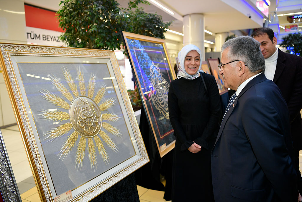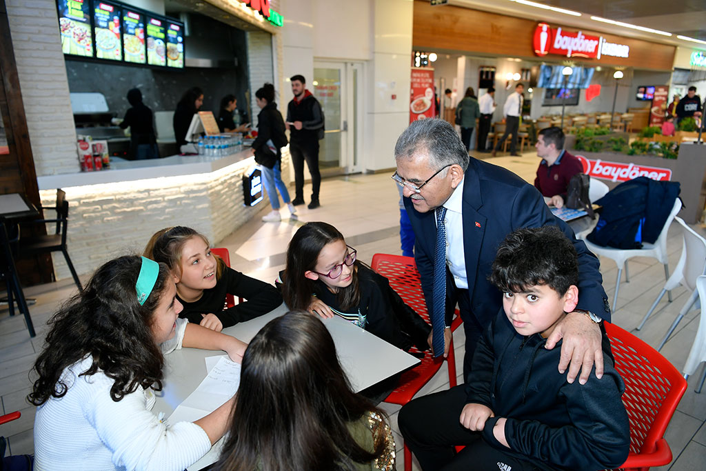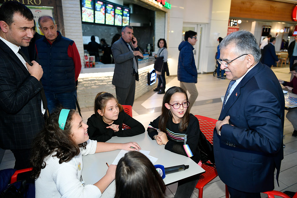 Kayseri Büyükşehir Belediye Başkanı Dr. Memduh Büyükkılıç, KAYMEK tarafından Kayseri Park AVM’de açılan “Bereket” temalı sergiyi gezdi. Başkan Büyükkılıç, Kayserilileri 26 farklı branştan ürünlerin yer aldığı sergiyi görmeye davet etti. Başkan Büyükkılıç, Kayseri Park AVM’de bir araya gelerek birbirlerine hediye almak için çekiliş yapan çocuklarla da karşılaştı ve kuraya kendisi de dahil oldu. Büyükşehir Belediye Başkanı Dr. Memduh Büyükkılıç, Kayseri Park AVM’ye giderek KAYMEK tarafından açılan sergiyi gezdi ve ürünlerle ilgili bilgi aldı. 26 branşta “Bereket” temasıyla yapılan ürünleri tek tek inceleyen Başkan Büyükkılıç, sergiyi gezen ziyaretçiler ve özellikle de çocuklarla yakından ilgilenerek sohbet etti. Kayseri halkını hafta sonu açık kalacak olan bu güzel sergiyi görmeye davet eden Başkan Memduh Büyükkılıç, “KAYMEK sergimiz her biri ayrı bir bereketi simgeleyen ürünlerle bizler büyüledi. Emeği geçen hocalarımıza ve kursiyerlerimize teşekkür ediyorum ve Kayserili hemşehrilerimi sergiyi görmeye davet ediyorum” dedi. BAŞKAN HEDİYE ÇEKİLİŞİNDE Büyükşehir Belediye Başkanı Büyükkılıç, Kayseri Park AVM’de birbirlerine hediye almak için çekiliş yapan bir öğrenci grubuyla da karşılaştı. Kuraya kendisini de dahil etmelerini isteyen Başkan Büyükkılıç, çekilişte çıkacak öğrenciye istediğini alacağını belirtti, kendisine de kitap alınmasını istedi. Çekilişte Ümran adlı öğrencinin çıkması üzerine ne istediğini soran Başkan Büyükkılıç, kıyafet isteyen öğrenciye hediyesini alışveriş merkezinden alarak anında verdi.
