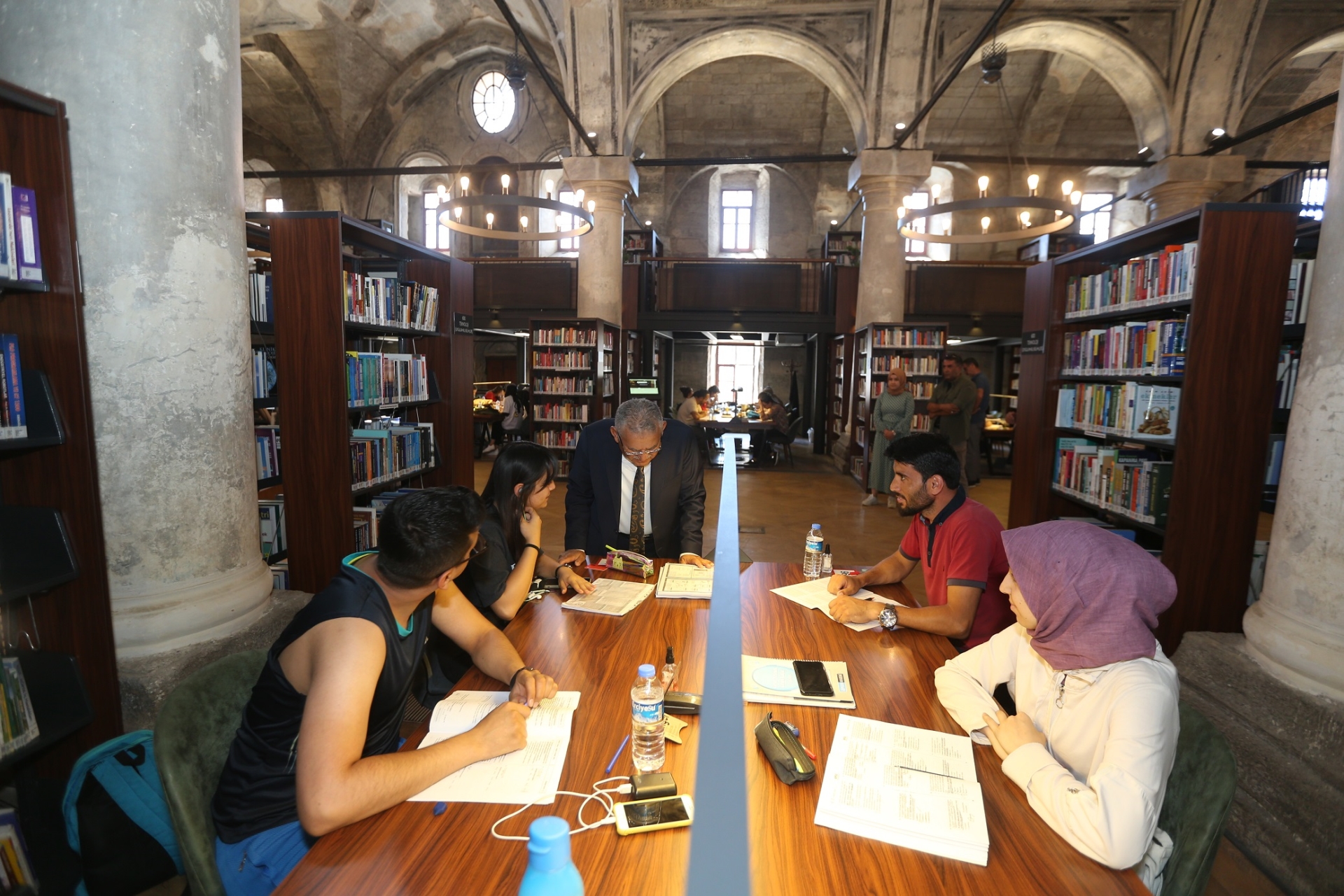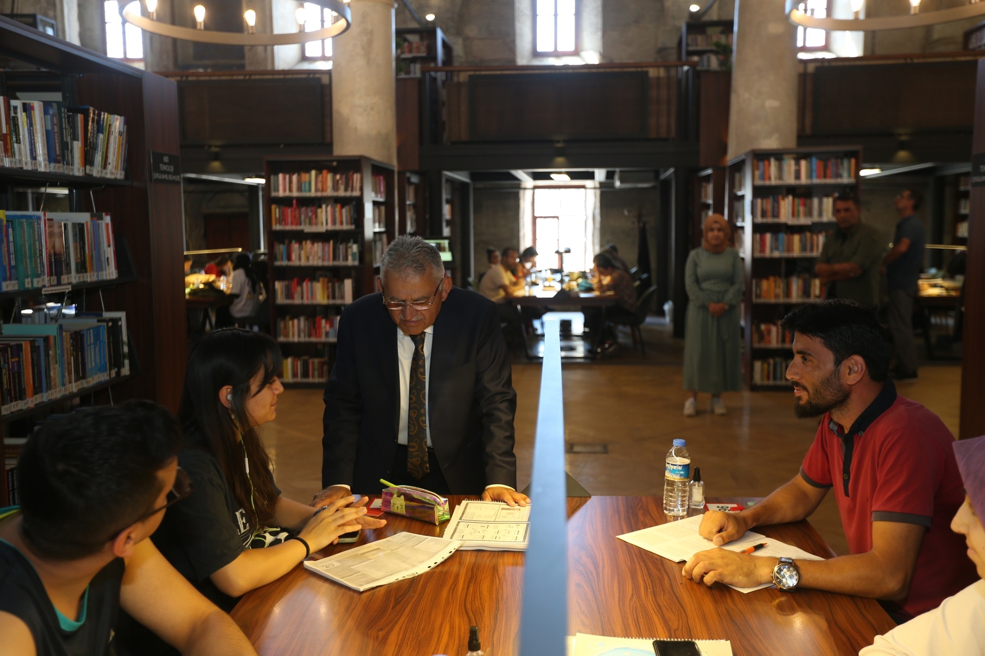 incelemelerde bulunarak, kütüphanede ders çalışan gençlere başarılar diledi.