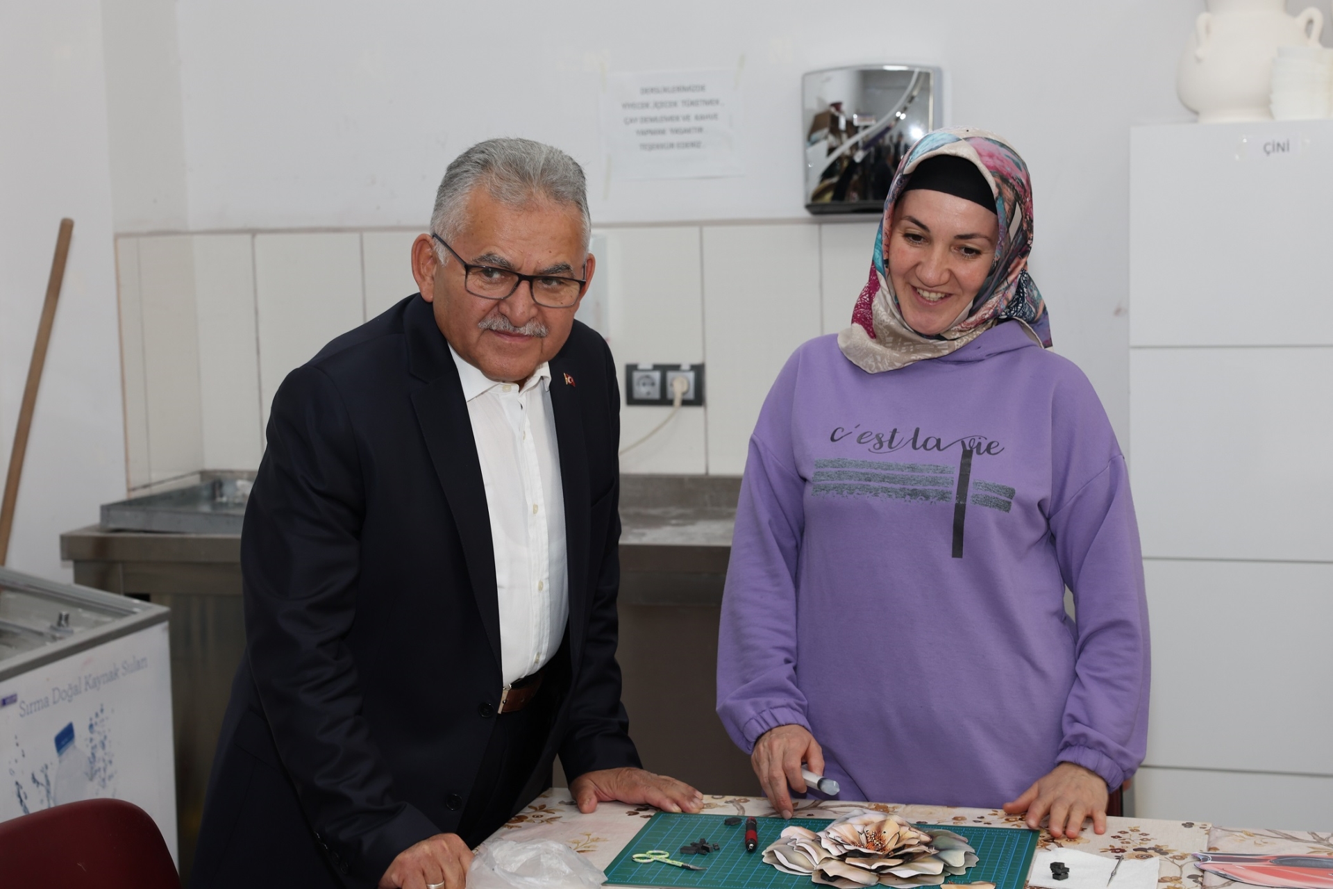 Kursiyerle sohbet eden Başkan Büyükkılıç ve beraberindeki