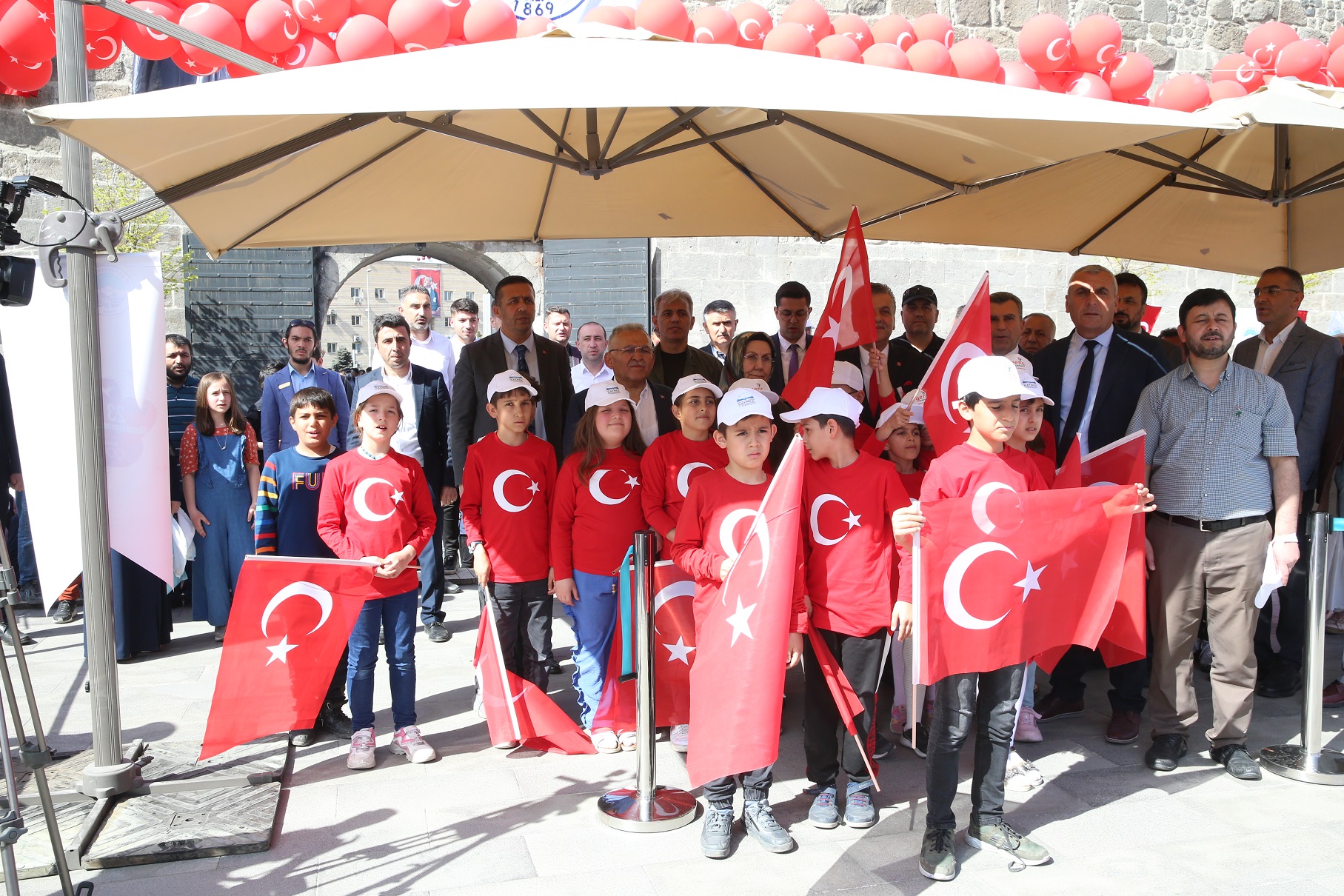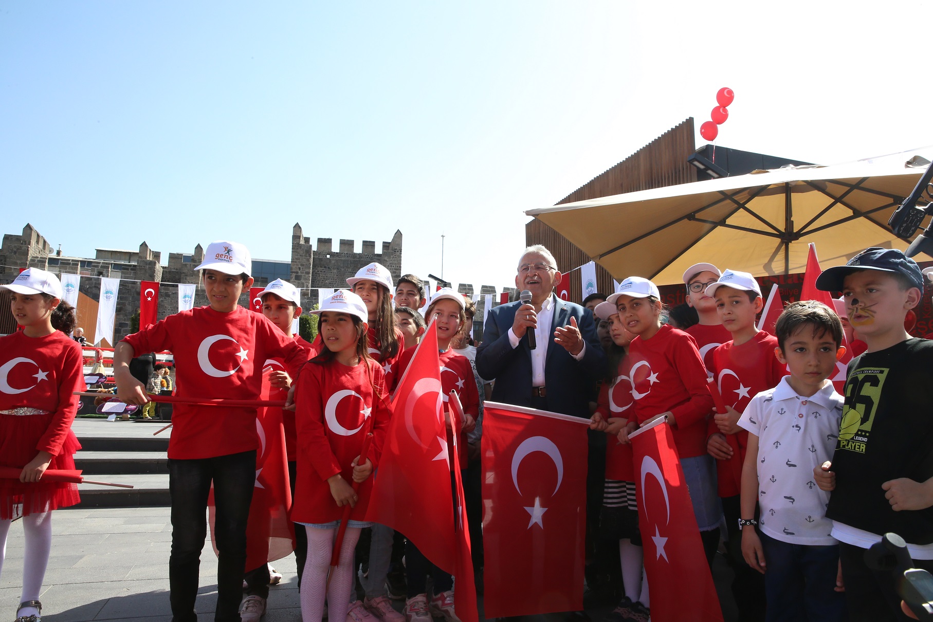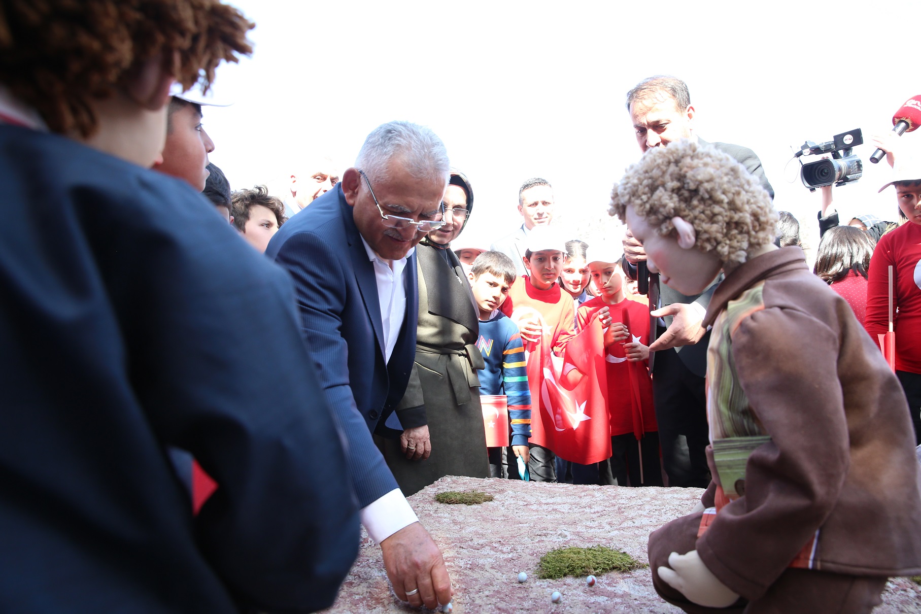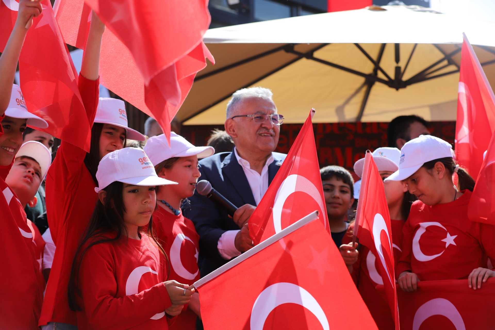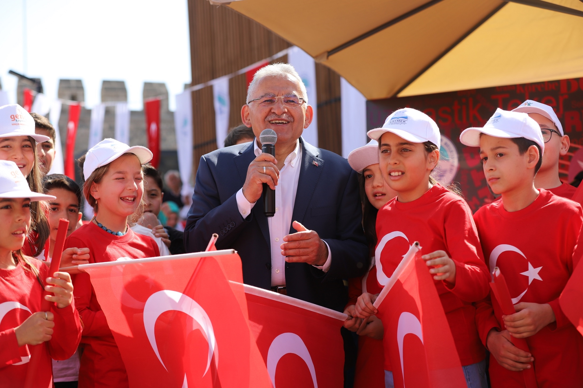Marşı’nın okunmasının ardından çocuklarla birlikte sahnede konuşan Başkan