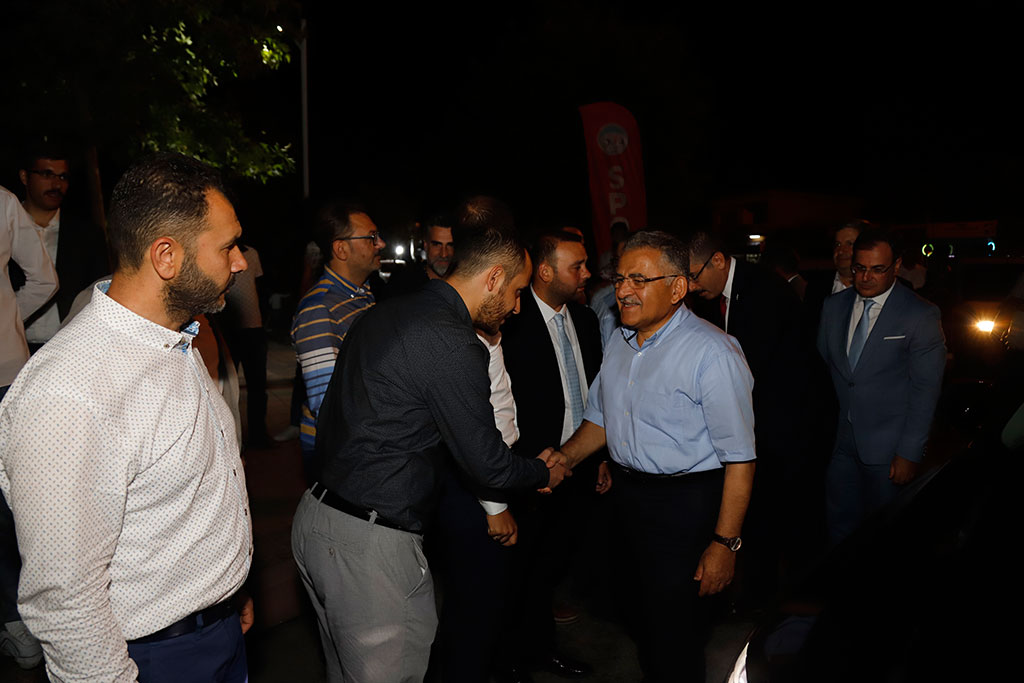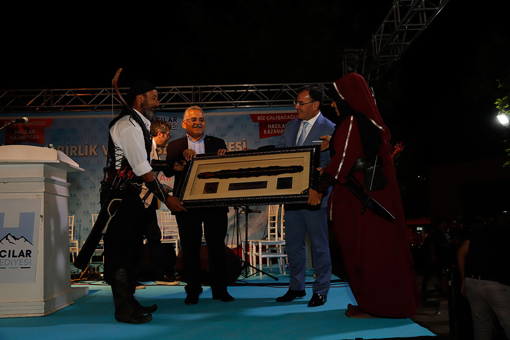 Kayseri Büyükşehir Belediye Başkanı Dr. Memduh Büyükkılıç, Sarıoğlan ve Özvatan ilçeleriyle Sivas’a bağlı Gemerek ilçesinde katıldığı programların ardından Hacılar’ın Birlik ve Beraberlik Gecesi’ne iştirak etti. Başkan Büyükkılıç, birlik ve beraberlik gibi kelimelerin içinin doldurulması için herkesin gayret göstermesi gerektiğini vurguladı. Büyükşehir Belediye Başkanı Dr. Memduh Büyükkılıç, Hacılar Sütdonduran Kampı ve Büyükşehir Belediyesi’ne bağlı Spor A.Ş.’nin etkinliklerinin gerçekleştirildiği Hacılar Birlik ve Beraberlik Gecesi’ne katıldı. Başkan Büyükkılıç, Hacılar Belediye Başkanı Bilal Özdoğan ve Hacılarlılar tarafından karşılandı. Burada yaptığı konuşmada Hacılarlılara her zaman gösterdikleri sıcak ilgi nedeniyle teşekkür eden Başkan Memduh Büyükkılıç, “Bizler de sizlere layık olmak için gece gündüz koşturuyoruz” ifadelerini kullandı. Konuşmasında birlik beraberliğin önemini vurgulayan Başkan Büyükkılıç, “Her zaman birlik beraberlik kelimelerinin içerisini dolduracak gayret içinde olmalıyız. El ele gönül gönüle Hacılar’ı daha iyi yerlere taşıma yönünde gayret gösteriyoruz. Büyükşehir olarak üzerimize ne düşüyorsa gerekeni yapma yönünde irade göstereceğimizden şüpheniz olmasın” dedi. Büyükşehir Belediye Başkanı Memduh Büyükkılıç’a gecede Hacılar Nal Sesleri Atlı Okçuluk ve Gençlik Spor Kulübü tarafından geleneksel ok üzerine yapılmış birlik beraberliği simgeleyen tablo hediye edildi.