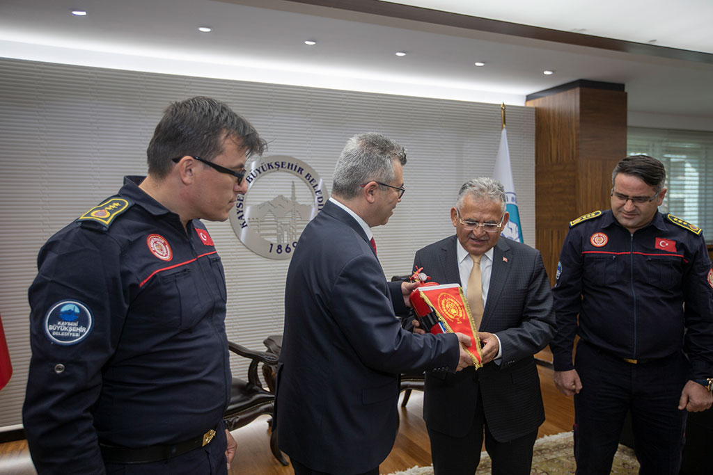 Büyükşehir Belediyesi İtfaiye Teşkilatı, 25 Eylül - 1 Ekim tarihleri arasında kutlanacak İtfaiye Haftası ve Kayseri İtfaiyesi’nin kuruluşunun 93’üncü yıl dönümü nedeniyle Büyükşehir Belediye Başkanı Dr. Memduh Büyükkılıç’ı ziyaret etti. Büyükşehir Belediyesi İtfaiye Daire Başkanı Mustafa Metin Kızılkan, ziyarette, Başkan Büyükkılıç’a 25 Eylül - 1 Ekim tarihleri arasında kutlanacak olan İtfaiye Haftası dolayısıyla yangın tüpü ve itfaiye flaması hediye etti. Daire Başkanı Kızılkan ve teşkilat mensuplarının İtfaiye Haftası’nı tebrik eden Başkan Büyükkılıç, “Cenab-ı Allah inşallah sizlerin uygulama yapmasını gerektirecek bir felaketle bizi karşı karşıya getirmesin ama yokluğunuzu da vermesin. Lazım olduğunda tabi ki canla başla kendinizi adeta heba edercesine koşturduğunuzu biliyorum. Yüz akımız olan, itfaiye hizmetlerinde örnek ve önder olan ekibimizi tebrik ediyorum. Allah bu ülkeyi, bu şehri kazalardan korusun diye de dua ediyorum” şeklinde konuşarak ziyaretleri için Kayseri Büyükşehir Belediyesi İtfaiye Teşkilatı’na teşekkür etti.