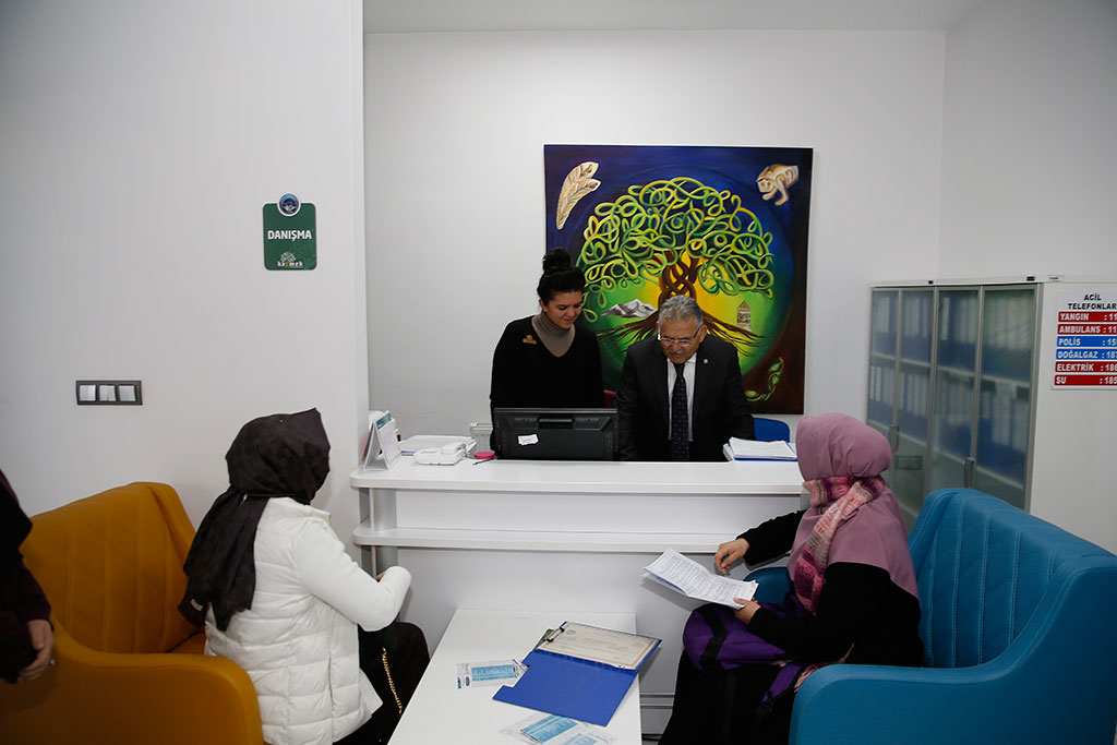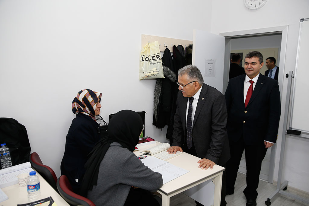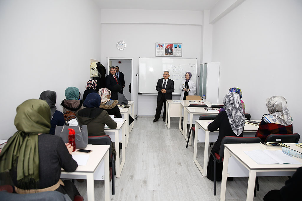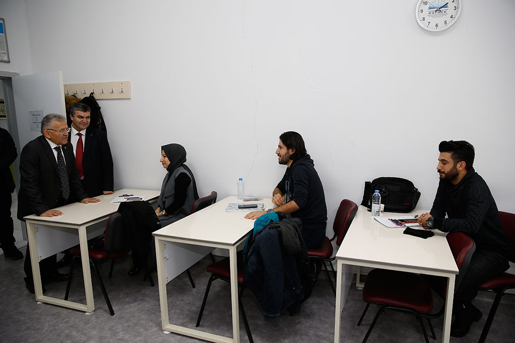 Kayseri Büyükşehir Belediye Başkanı Dr. Memduh Büyükkılıç, Talas Yolu üzerinde hizmet veren KAYMEK Akademi’yi ziyaret etti. Başkan Büyükkılıç, sanat ve mesleki eğitim kurslarının verildiği sınıflara girerek kursiyerlerle sohbet etti. Büyükşehir Belediye Başkanı Dr. Memduh Büyükkılıç, Büyükşehir Belediyesi’nin hizmet birimlerine yönelik ziyaretlerini KAYMEK Akademi ile sürdürdü. Talas Yolu’ndaki hizmet binasında faaliyet gösteren KAYMEK Akademi’deki sanat ve mesleki eğitim kurslarını ziyaret eden Başkan Memduh Büyükkılıç, verilen kurslarla ilgili bilgi aldı. Sanat ve mesleki eğitim kurslarının verildiği sınıflara da giren Başkan Memduh Büyükkılıç, eğitmenler ve kursiyerlerle görüştü. Başkan Memduh Büyükkılıç, kursiyerlerden katıldıkları kurslarla ilgili görüşlerini aldı. KAYMEK kurslarına katılan kursiyerler Büyükşehir Belediyesi’nin bu önemli hizmetiyle ilgili Başkan Büyükkılıç’a teşekkür ettiler.