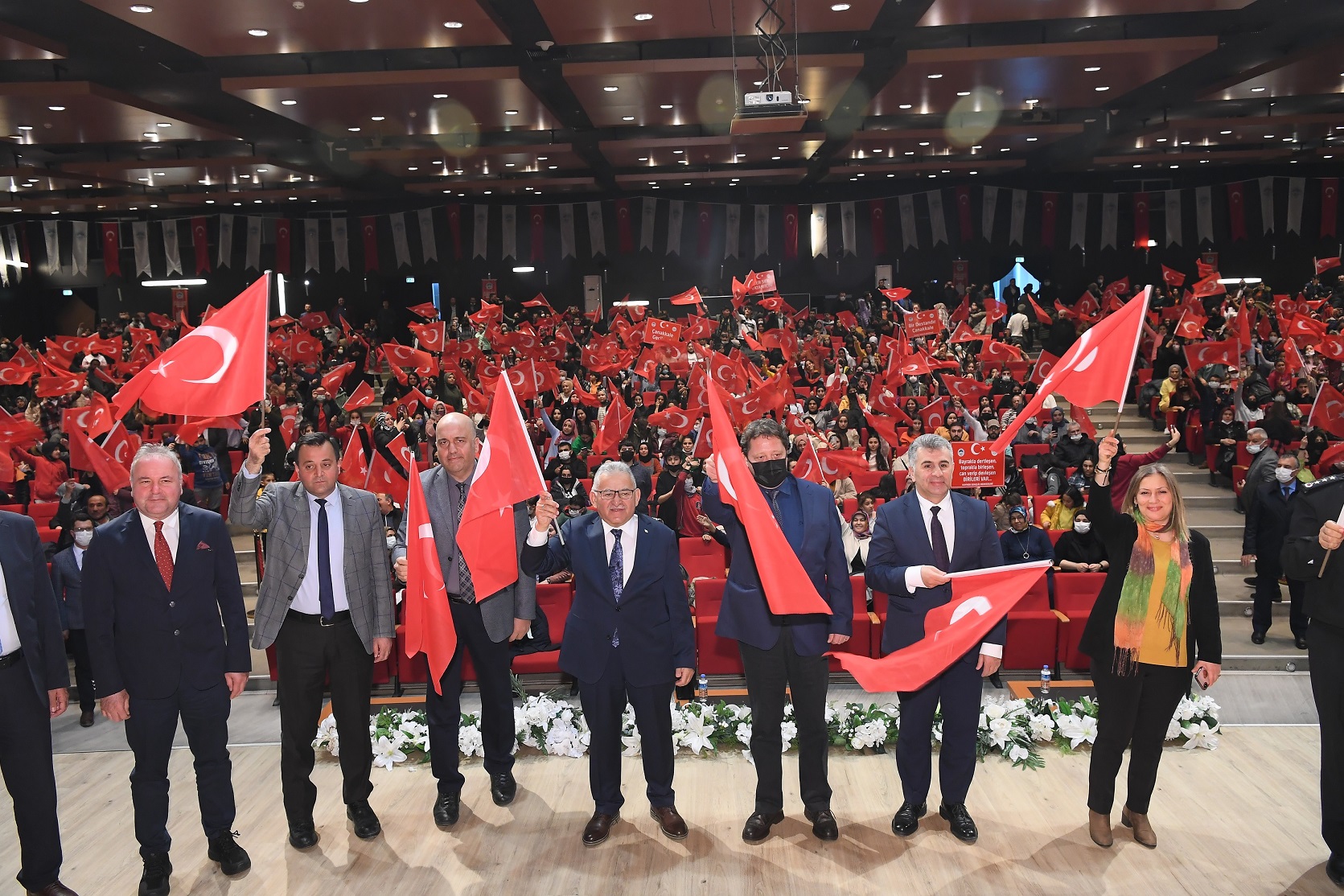 belirten ve salonu dolduran öğrencilerle birlikte, İstiklal Marşı’nın 4’üncü ve