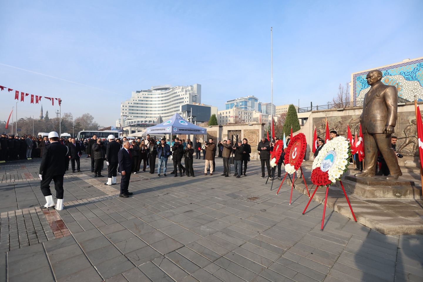 Gazi Mustafa Kemal Atatürk’ün, Heyet-i Temsiliye Reisi sıfatıyla Kayseri’ye ilk gelişinin 106’ncı yılı, Cumhuriyet Meydanı’nda düzenlenen törenle coşku ve gurur içerisinde kutlandı. Atatürk Anıtı önünde gerçekleştirilen törene Kayseri Büyükşehir Belediye Başkanı Dr. Memduh Büyükkılıç’ın yanı sıra Kayseri Valisi Gökmen Çiçek, Garnizon Komutanı Tümgeneral Kadircan Kottaş, protokol üyeleri, siyasi parti temsilcileri, gaziler, sivil toplum kuruluşları ve çok sayıda öğrenci katıldı.