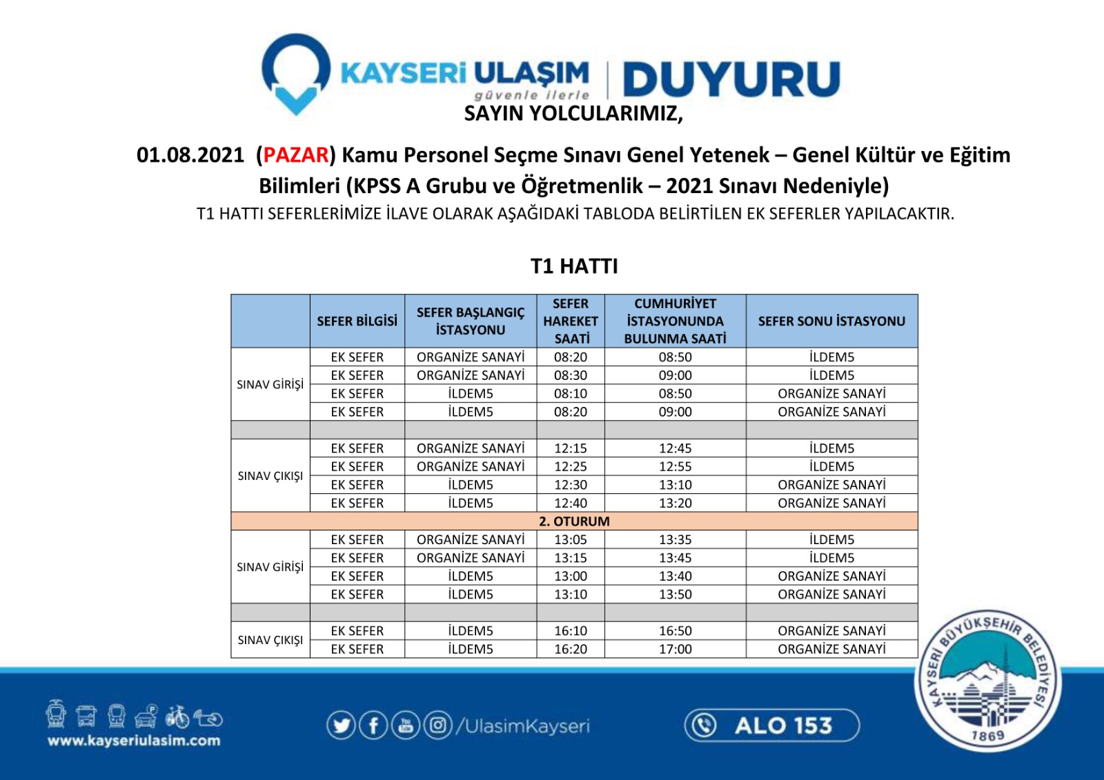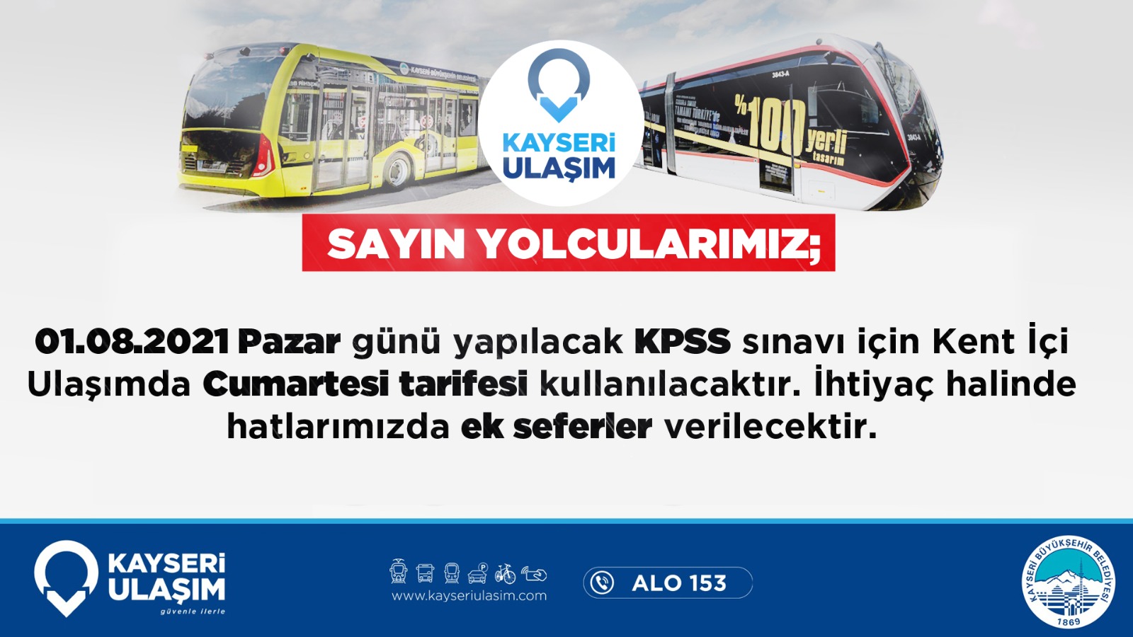 KPSS SINAVI İÇİN KENT İÇİ ULAŞIMDA CUMARTESİ TARİFESİ