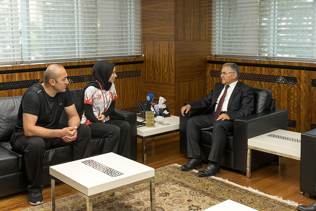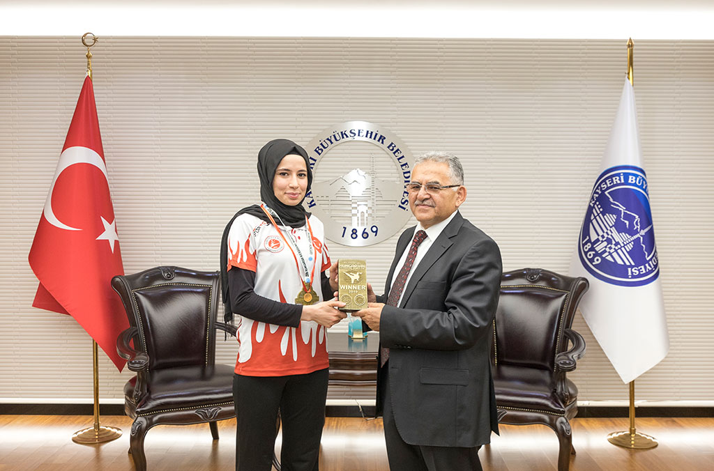 Büyükşehir Belediye Başkanı Dr. Memduh Büyükkılıç, Kickboks Dünya Kupası’nda şampiyon olan Spor A.Ş. sporcusu Hayriye Türksoy’u altınla ödüllendirdi. Başkan Büyükkılıç, genç sporcuya tavsiyelerde de bulunarak eğitimini aksatmadan spora devam etmesini istedi. Kayseri Büyükşehir Belediyesi Spor A.Ş. Gençlik ve Spor Kulübü bünyesinde bulunan Hayriye Türksoy, 16-19 Mayıs tarihleri arasında Macaristan’ın başkenti Budapeşte’de düzenlenen Kickboks Dünya Kupası müsabakalarında 48 kg’da mücadele etmiş ve rakiplerini geride bırakarak Dünya Kupası Şampiyonu olmuştu. Şampiyon sporcu Büyükşehir Belediye Başkanı Dr. Memduh Büyükkılıç’ı ziyaret etti. Hayriye Türksoy’u başarısından dolayı tebrik eden Başkan Büyükkılıç, genç sporcunun eğitimini aksatmadan spora devam etmesini istedi. Hayriye Türksoy’a başarılarının devam etmesi temennisinde bulunan Başkan Büyükkılıç, genç sporcuyu altınla ödüllendirdi.