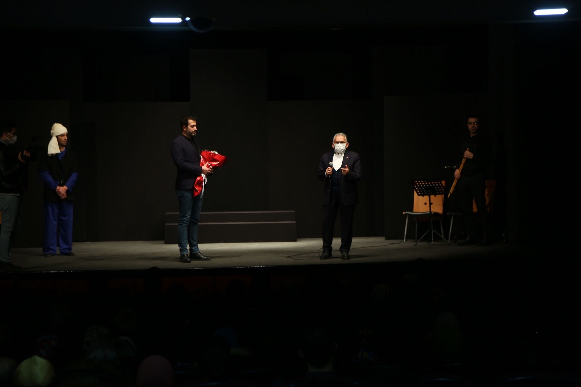 Başkan Büyükkılıç, tiyatro sonunda sahneye çıkarak, ekibi tebrik etti.