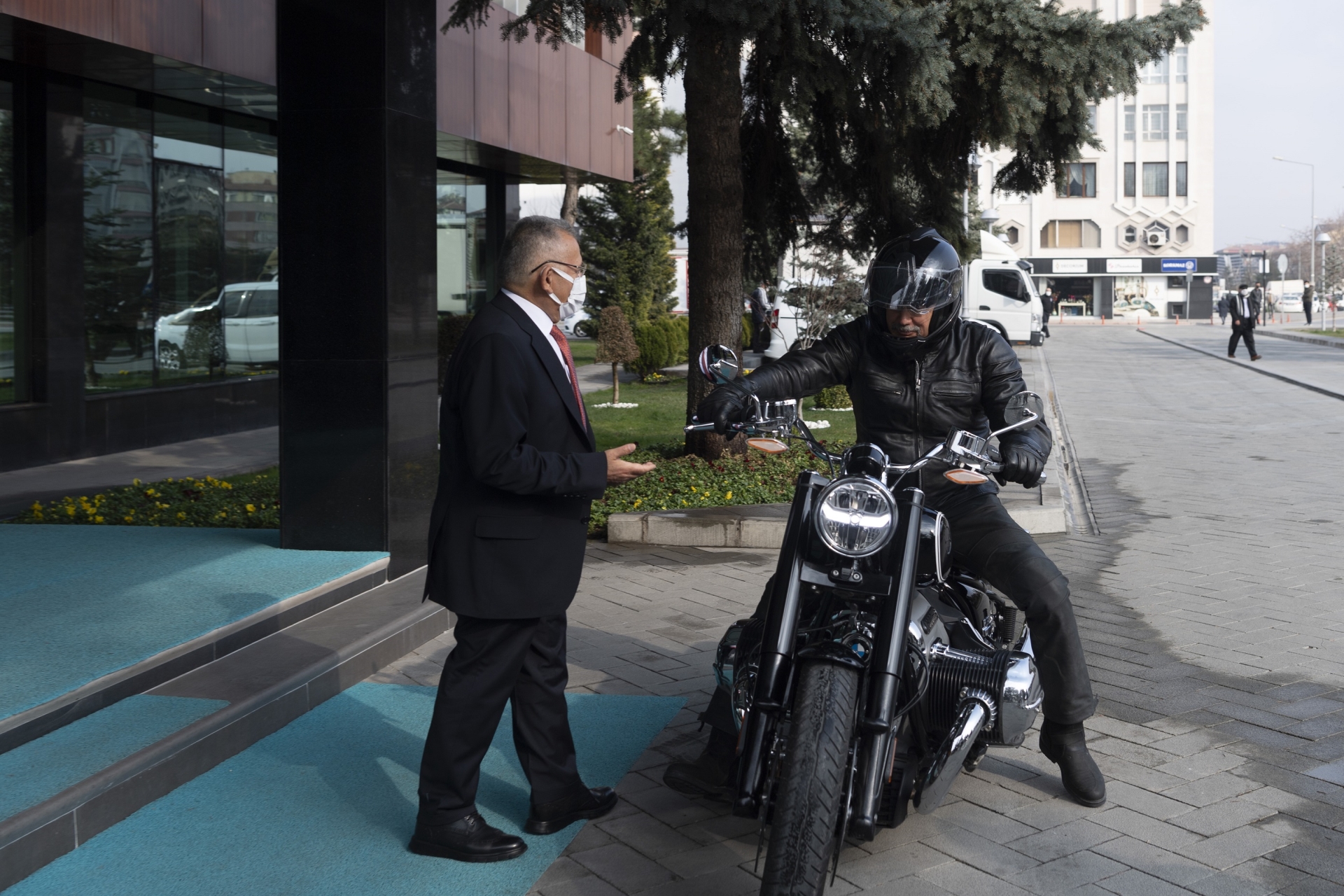 Büyükşehir Belediyesi’ne motosikletiyle gelen Tüzmen’i Başkanlık girişinde