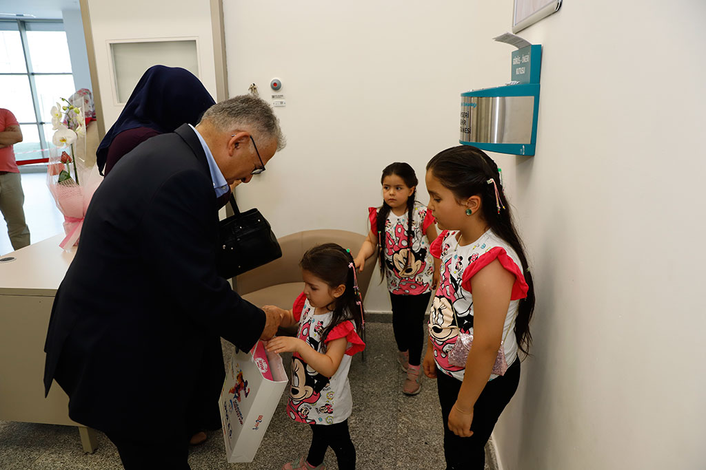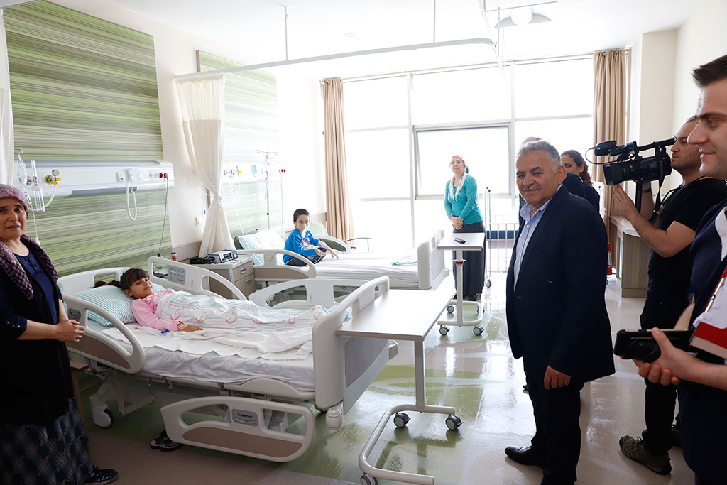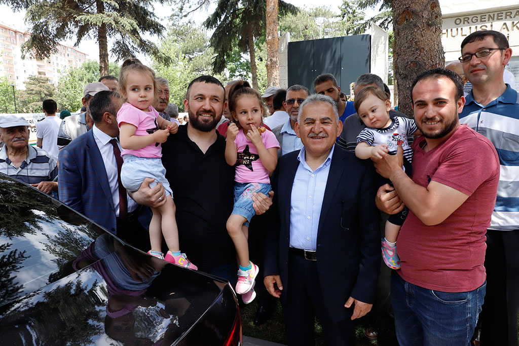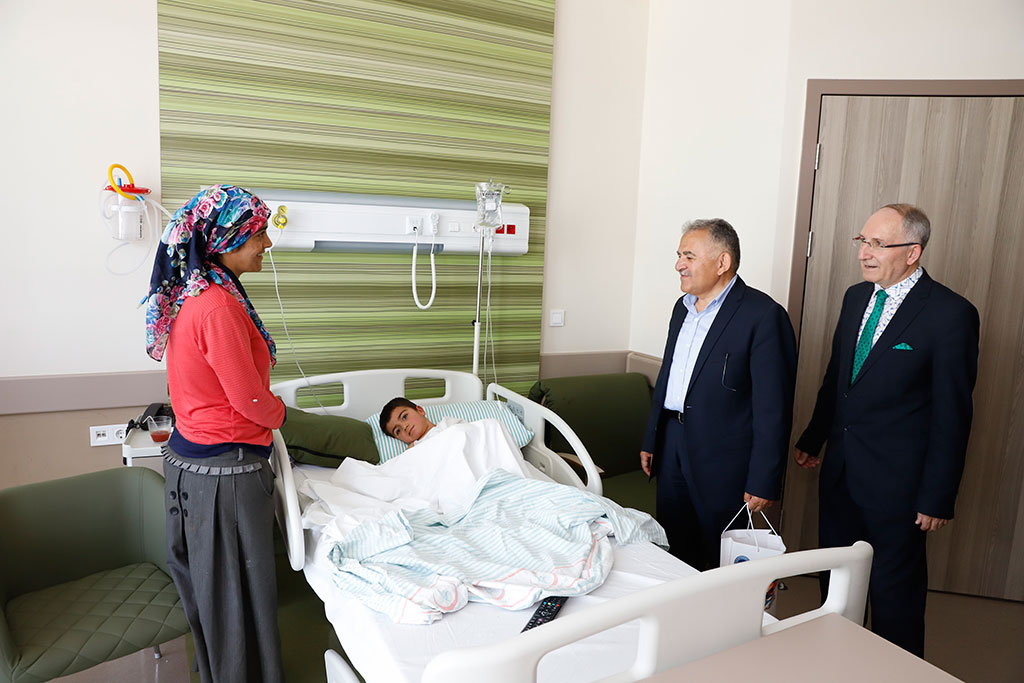 Büyükşehir Belediye Başkanı Dr. Memduh Büyükkılıç Ramazan Bayramı Arefesi’nde Asri Mezarlık ve Çocuk Hastanesi’ne ziyaretlerde bulundu. Başkan Büyükkılıç Orgeneral Hulusi Akar Camisi’nde kıldığı öğle namazının ardından cenaze namazlarına katıldı, mezarlık ziyaretlerine gelenlerin Arefe ve Bayramı’nı tebrik etti. Büyükkılıç, hasta çocuklarla da yakından ilgilendi. Yoğun bir Ramazan Ayı programı geçirerek 7’den 70’e bütün kesimle kucaklaşan Büyükşehir Belediye Başkanı Dr. Memduh Büyükkılıç, Ramazan Bayramı’nın Arefesi’nde de hemşehrilerini ihmal etmedi. Mezarlık ziyaretlerini gerçekleştirmek üzere Asri Me gelen vatandaşlarla görüşen Başkan Büyükkılıç “Rabbim bizleri hep birlikte diğer bayramlara eriştirsin diye dua ediyoruz” dedi. BİR ZİYARETTE HASTA ÇOCUKLARA Mezarlık ziyaretlerinin ardından Kayseri Şehir Hastanesi’ne geçen Başkan Büyükkılıç, burada Çocuk Hematoloji, Çocuk Enfeksiyon Servisi ve Süt Çocuğu Servislerini ziyaret ederek tedavi gören çocuklarla yakından ilgilendi, hediyeler verdi. Karşılarında Büyükşehir Belediye Başkanı Dr. Memduh Büyükkılıç’ı gören hasta yakınları şaşkınlıklarını ve mutluluklarını gizleyemedi. Her girdiği tedavi odasında hasta yakını ve hasta ile bire bir ilgilenen Başkan Büyükkılıç, geçmiş olsun temennisinde bulundu.