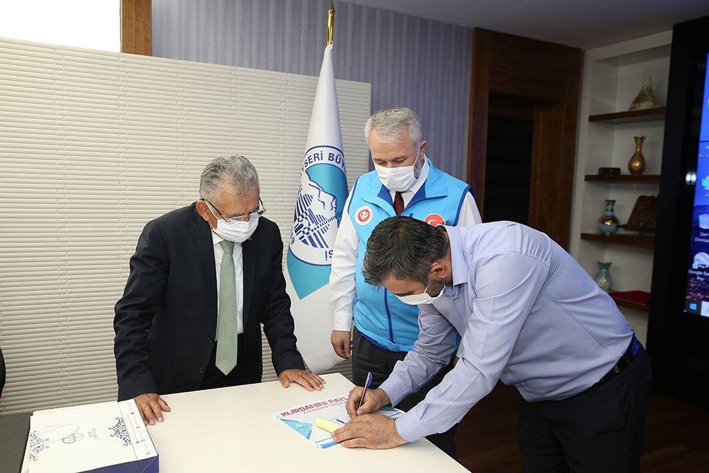 Kayseri Büyükşehir Belediye Başkanı Dr. Memduh Büyükkılıç, her yıl olduğu gibi bu yılda Türkiye Diyanet Vakfı'na kurban bağışında bulundu. Başkan Büyükkılıç, “Her şeyden önce insanlığa hizmet sevdasıyla böyle bir gayretin içerisinde yer alan Türkiye Diyanet Vakfı’na teşekkür ediyoruz” dedi. Büyükşehir Belediye Başkanı Dr. Memduh Büyükkılıç, İl Müftüsü Prof. Dr. Şahin Güven’i kabulünde, Türkiye Diyanet Vakfı’na kurban bağışında bulundu. Kurban Bayramı vesilesiyle 65 ülkeye gidecek olan bağışların ihtiyacı olan insanlara ulaştırılacak olmasının mutluluğunu yaşadıklarını belirten Başkan Büyükkılıç, şöyle konuştu: “Her şeyden önce insanlığa hizmet sevdasıyla böyle bir gayretin içerisinde olduğunuz için teşekkür ediyoruz. Bizlerde güvenilen bir kurum olarak yanınızda yer aldığımızı ve bu senede yine yer alma konusunda irade gösterdiğimizi paylaşmak istiyorum. Cenabı Allah riyadan korusun. Rızasına uygun kabul etsin diyoruz” dedi. Başkan Büyükkılıç’a kurban bağışı dolayısıyla teşekkür eden İl Müftüsü Prof. Dr. Şahin Güven, Başkan Büyükkılıç’ın sürekli olarak Türkiye Diyanet Vakfı'nın yanında olduğunu belirterek yardımlarını ve desteklerini hiç eksik etmediğini söyledi. Güven, “Şahsım adına, müftülüğüm adına ve Türkiye Diyanet Vakfı adına teşekkür ederken, aynı zamanda dünyanın da mağdurları, muhtaçları içinde teşekkür ediyorum. Allah razı olsun. Kurban vesilesiyle bu yıl da dünyanın 65 ülkesine ulaşacağız, dünyanın mazlumlarına yardım edeceğiz” dedi. İl Müftüsü Prof. Dr. Şahin Güven, kurban bağışının ardından Başkan Büyükkılıç’a Kuran-ı Kerim hediye etti.