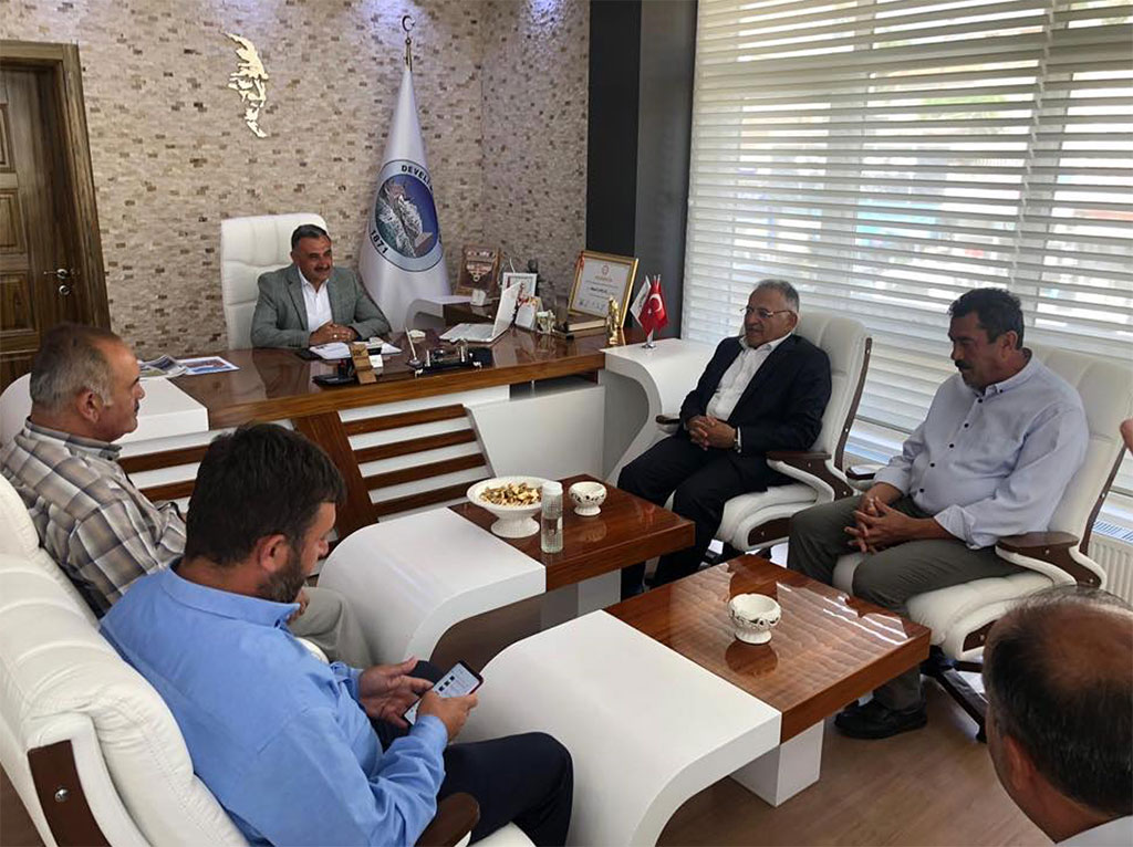 Kayseri Büyükşehir Belediye Başkanı Dr. Memduh Büyükkılıç, şehir merkezindeki çalışmalarının yanı sıra sık sık ilçeleri de ziyaret etmeye devam ediyor. Başkan Büyükkılıç, Yahyalı ve Develi ilçelerini ziyaret ederek ilçe belediye başkanları ile bir araya geldi. Büyükşehir Belediye Başkanı Dr. Memduh Büyükkılıç, Yahyalı Belediye Başkanı Esat Öztürk’ü ziyaret etti. Başkan Büyükkılıç, ziyaretinde Yahyalı Belediye Başkanı Öztürk’ten ilçeye yapılması gereken yatırımlar ve devam eden çalışmalarla ilgili bilgiler aldı. Büyükşehir Belediye Başkanı Büyükkılıç, Yahyalı’nın ardından Develi ilçesine geçerek Develi Belediye Başkanı Mehmet Cabbar’ı ziyaret etti. Başkan Büyükkılıç, Develi’de de ilçeye yapılacak olan yatırım ve hizmetlerle ilgili değerlendirmelerde bulundu.