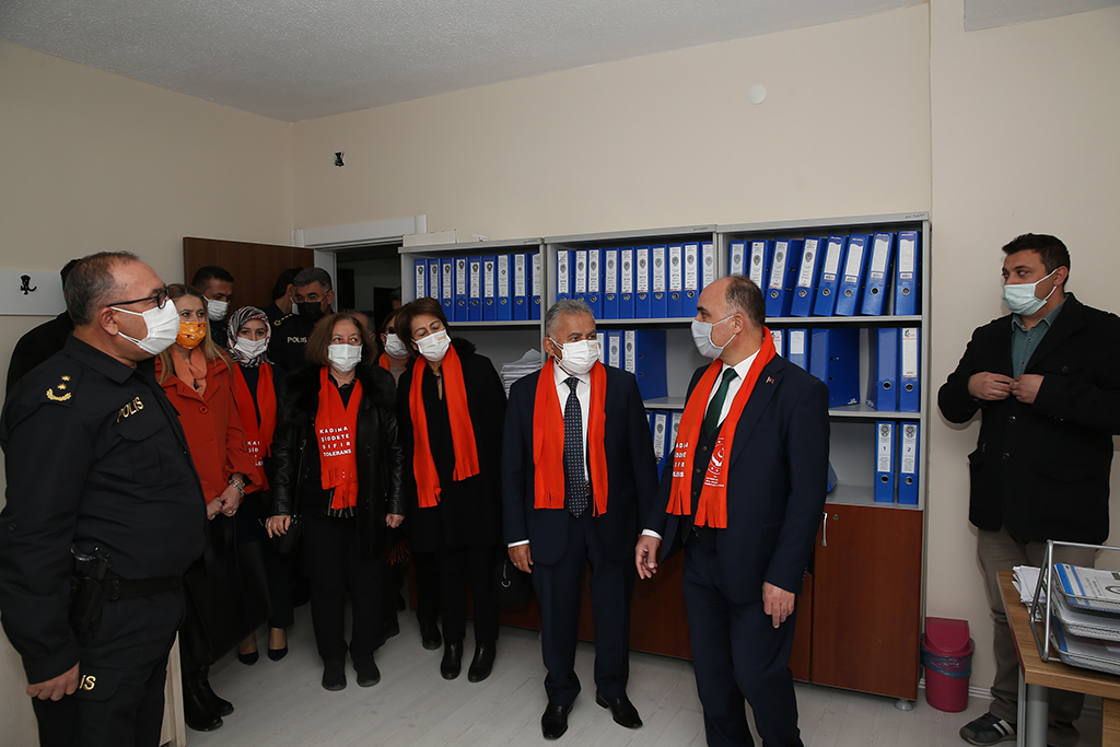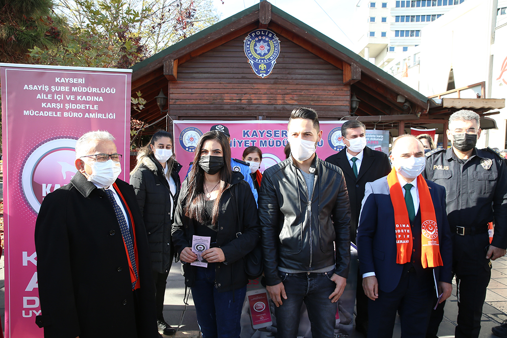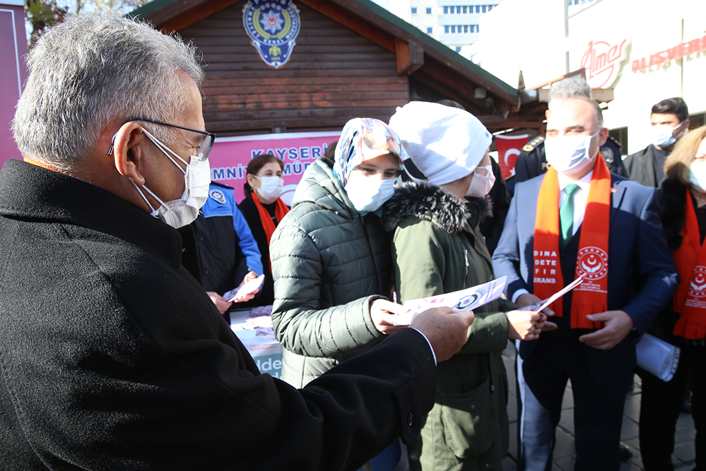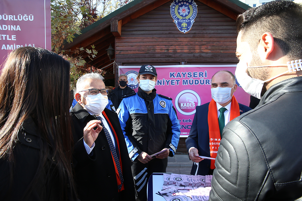 Kayseri Büyükşehir Belediye Başkanı Dr. Memduh Büyükkılıç, kadına yönelik şiddetin önüne geçilmesi ve farkındalık oluşturmak amacıyla Cumhuriyet Meydanı’nda kadınlar ile buluşup, ‘kadına şiddete sıfır tolerans’ yazılı maske ve atkı taktı, kadına şiddete ilişkin bilgilerin yer aldığı broşürü vatandaşlara dağıttı. Başkan Büyükkılıç, “Kadınlara şiddet konusunda duyarlılık gösteriyoruz, sıfır tolerans” dedi. Başkan Büyükkılıç, 25 Kasım Kadına Yönelik Şiddete Karşı Uluslararası Mücadele ve Dayanışma Günü dolayısıyla Cumhuriyet Meydanı’nda Emniyet Müdürlüğü’nce kurulan Kadın Acil Destek Uygulaması (KADES) standını ziyaret etti. Kadın dernek temsilcileri ile de görüşen Başkan Dr. Büyükkılıç, burada yaptığı açıklamada, kadına şiddete sıfır tolerans gösterildiğini vurgulayarak, ‘kadına şiddete sıfır tolerans’ yazılı maske ve atkı ile şiddete karşı farkındalık oluşturdu. Her türlü canlıya şiddetin insanlık suçu olduğunu, kadına yönelik şiddetin de asla kabul edilemeyeceğini vurgulayan Başkan Büyükkılıç, “Şiddet; şiddettir, kadınlara yönelik şiddet asla kabul edilemez. Kadınlara şiddet konusunda duyarlılık gösteriyoruz, sıfır tolerans diyoruz. Cumhurbaşkanlığımız ve bakanlıklarımız önderliğinde kurum ve kuruluşlarımızla, sivil toplum örgütleriyle iş birliği yapıyoruz. İçişleri Bakanlığı’nın KADES uygulamasını da çok önemsiyoruz. Eğer şiddete uğrandığı zaman kadınların hemen yetkililere bildirmeleri konusunda kendilerine tavsiyelerde bulunuyoruz” diye konuştu. Başkan Büyükkılıç, daha sonra vatandaşlara broşür dağıtırken, dağıtılan broşürlerde kadına yönelik şiddet konusunda alınabilecek tedbirler ile şiddete maruz kalan kişilerin nerelere başvurabilecekleri bilgileri yer aldı. Ayrıca Büyükşehir Belediye Başkanı Dr. Memduh Büyükkılıç, Vali Şehmus Günaydın, İl Emniyet Müdürü Kamil Karabörk ile birlikte Kocasinan İlçe Emniyet Müdürlüğü’ndeki Aile İçi ve Kadına Karşı Şiddetle Mücadele Amirliği’ni de ziyaret ederek, polis memurlarından bilgi aldı.