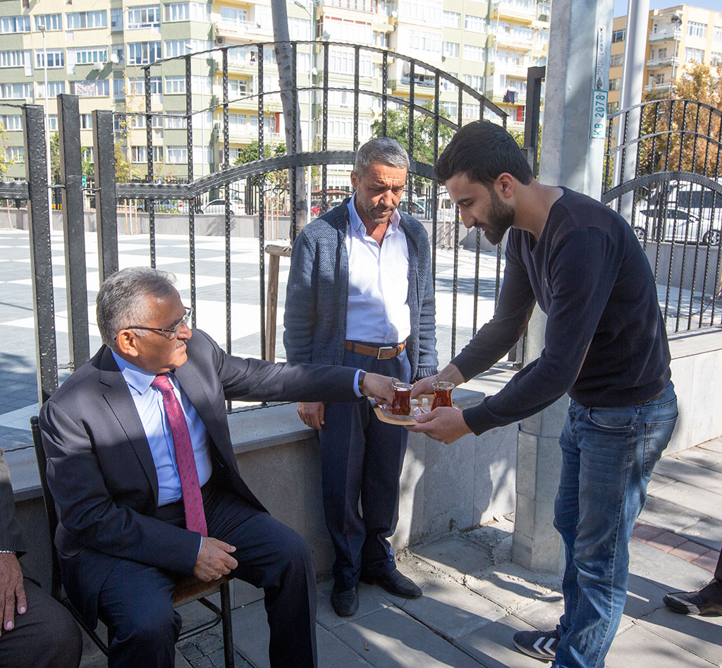 Başkan Büyükkılıç, esnafla birlikte çay içti ve sohbet etti. Büyükşehir Belediye Başkanı Dr. Memduh Büyükkılıç, sık sık gerçekleştirdiği ziyaretlerine bir yenisini daha ekleyerek Sahabiye Mahallesi’ndeki Fatih Taksi Durağı’na ziyarette bulundu. Esnaflarla taksi durağının hemen yanında bir süre oturan Başkan Büyükkılıç, yoldan geçen vatandaşlarla da selamlaştı. Taksici esnafı ile çay içen Başkan Büyükkılıç, Kayseri ile ilgili görüşlerini aldı ve hayırlı işler temennisinde bulundu. Başkan Memduh Büyükkılıç, esnaflarla hatıra fotoğrafı çektirdikten sonra taksi durağından ayrıldı.
