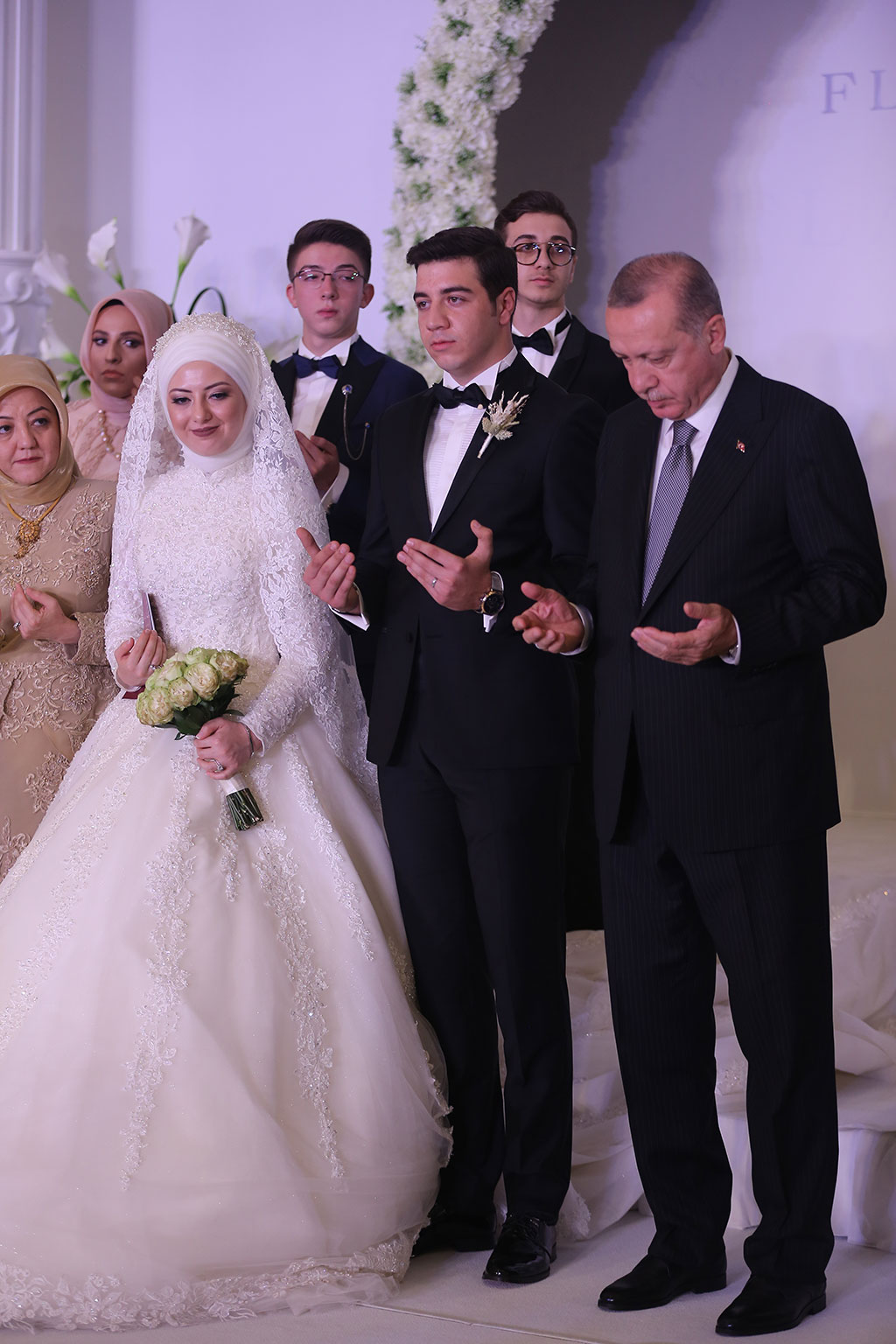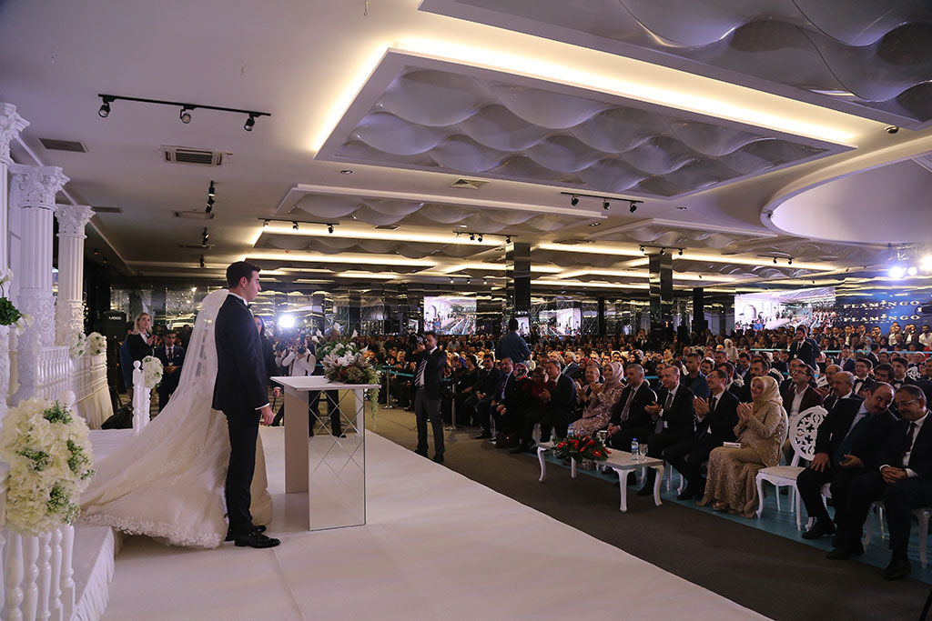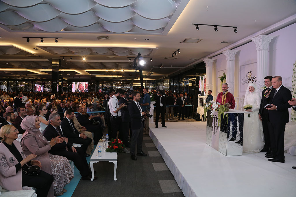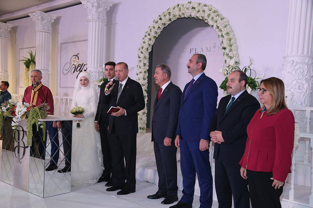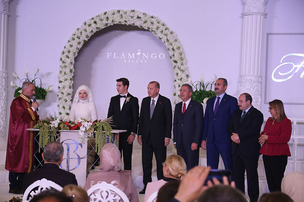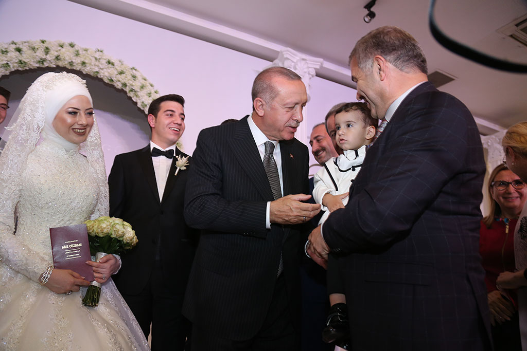 Büyükşehir Belediye Başkanı Mustafa Çelik ve eşi İkbal Çelik, oğulları Furkan Çelik’i evlendirmenin mutluluğunu yaşadı. Çelik ailesinin bu mutlu günlerine Cumhurbaşkanımız Recep Tayyip Erdoğan da katıldı. Furkan ve Beyza çiftinin nikah şahitliğini yapan Cumhurbaşkanı Erdoğan “İki dünya saadeti diliyorum” ifadeleriyle mutluluklar temennisinde bulundu. Büyükşehir Belediye Başkanı Mustafa Çelik ve eşi İkbal Çelik, dünürleri Nimet ve Mahmut Selçuki ile birlikte tüm misafirleri kapıda karşıladılar. Flamingo De Luxe’de yapılan düğün törenine siyaset, bürokrasi, iş, spor ve sanat dünyasından kalabalık bir davetli topluluğu katıldı. Düğüne iştirak eden Cumhurbaşkanımız Recep Tayyip Erdoğan’ı Büyükşehir Belediye Başkanı Çelik, eşi ve dünürleri ile birlikte düğün salonu girişinde karşıladı. Cumhurbaşkanımızın yerini almasıyla birlikte Kuran-ı Kerim okundu ve dualar edildi. Duaların ardından Beyza ve Furkan çifti sahneye çıktı. Çiftin nikahını İl Müftüsü Doç. Dr. Şahin Güven kıydı. Çiftin şahitliklerini Cumhurbaşkanımız Recep Tayyip Erdoğan ile birlikte Milli Savunma Bakanı Hulusi Akar, Adalet Bakanı Abdülhamit Gül, Sanayi ve Teknoloji Bakanı Mustafa Varank ile Ticaret Bakanı Ruhsar Pekcan yaptı. “GÜÇLÜ AİLELER GÜÇLÜ MİLLETLERİ OLUŞTURUR” İl Müftüsü Güven, gençlerden “Evet” cevabını aldıktan sonra şahitlerin onayını istedi. Cumhurbaşkanımız Erdoğan “Şahit oldum, iki dünya saadeti diliyorum” cevabını verdi. Cumhurbaşkanımız Erdoğan nikah töreninde yaptığı konuşmada gençlere mutluluklar dileyerek, “Evlilik uzun bir yolculuk. Benim bir nasihatim var, bunu biliyorsunuz ama şahitlerin huzurunda tekrar ediyorum. Bir olur garip olur, iki olur rakip olur, üç olur denge olur, dört olur bereket olur, gerisi Allah Kerim. Zira milletler ailelerden oluşur. Güçlü aileler güçlü milletleri oluşturur. İki şuurlu gencimiz var. İnşallah bu aile yuvasını geliştirecekler. Rabbim yar ve yardımcınız olsun” dedi ve aile cüzdanını geline verdi. Aile fotoğrafı çekilirken dualar edildi. Başkan Çelik, dua sırasında torununu kucağına aldı. Cumhurbaşkanımız Erdoğan Başkan Çelik’in torunu ile bir süre yakından ilgilendi.
