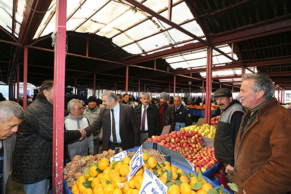 Pazarda alışveriş yapan vatandaşlar ve pazarcı esnafı ile sohbet eden Başkan Çelik'e pazarcı esnafı tarafından meyve ikram edildi.