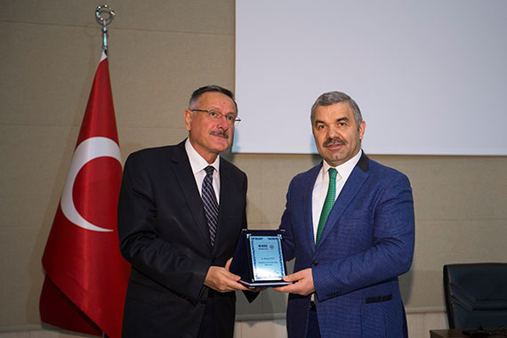 Söyleşinin ardından Büyükşehir Belediye Başkanı Mustafa Çelik'e Erciyes Üniversitesi Rektör Yardımcısı Prof. Dr. Mustafa Kemal Apalak ile Mühendislik Fakültesi Dekanı Prof. Dr. Kenan Danışman tarafından günün anısına birer teşekkür plaketi verildi.