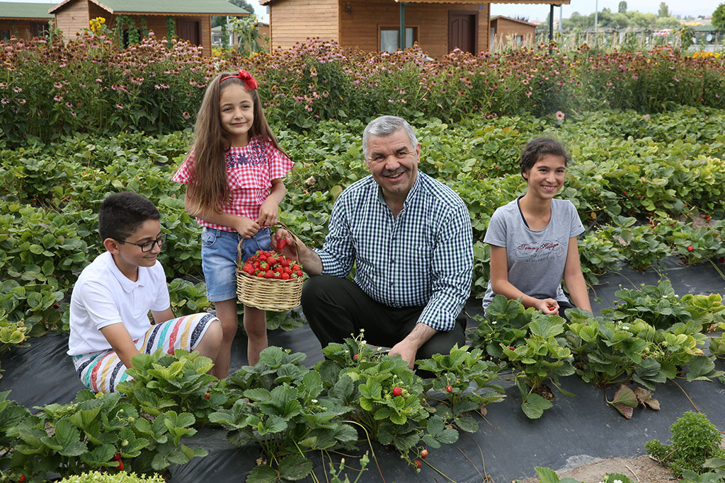 Büyükşehir Belediyesi’nin Türkiye’ye örnek projelerinden birisi olan Doğal Ürünler Bahçesi ve Pazarı yeni sezonda da halka tamamen doğal ve organik ürünleri sunmaya devam ediyor. Büyükşehir Belediye Başkanı Mustafa Çelik, Doğal Ürünler Bahçesi ve Pazarı’nı ziyaret etti, üreticilerle görüştü ve bahçelerdeki ürünlerden topladı. Büyükşehir Belediyesi’nin Anadolu Harikalar Diyarı yanında 60 bin metrekarelik alanda kurduğu Doğal Ürünler Bahçesi ve Pazarı, yeni sezon ürünleriyle sağlıklı beslenmek isteyenleri bekliyor. Büyükşehir Belediye Başkanı Mustafa Çelik, Doğal Ürünler Bahçesi ve Pazarı’nı ziyaret ederek incelemelerde bulundu. Üreticilerle bir araya gelerek sohbet eden ve bahçeleri gezerek ürünleri inceleyen Başkan Mustafa Çelik, bahçelerden tamamen doğal yollarla üretilmiş çilek, domates gibi ürünlerden topladı. 60 bin metrekarelik alandaki Doğal Ürünler Bahçesi ve Pazarı’nda yer alan 54 bahçede tamamen organik ve doğal üretim yapıldığını ifade eden Başkan Çelik, sağlıklı beslenmek isteyen aileleri Cumartesi ve Pazar günleri kurulan Doğal Ürünler Pazarı’nda alışveriş yapmaya davet etti.