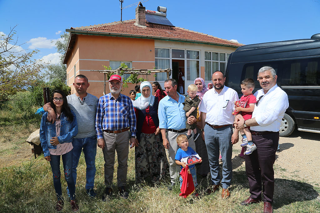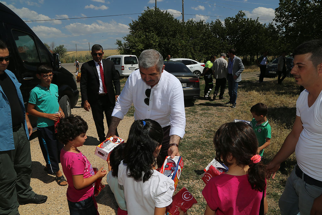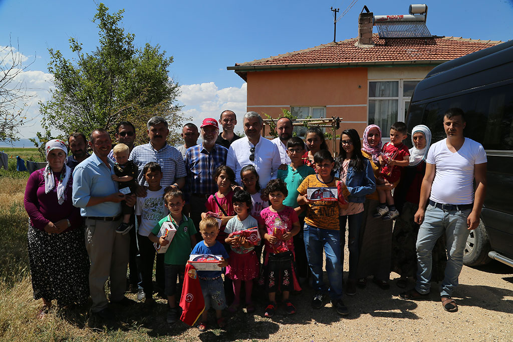 Büyükşehir Belediye Başkanı Mustafa Çelik, Akkışla Yeni Yoğurt Bayramı ve Kilim Festivali’ne katıldıktan sonra Sarıoğlan ilçesinin Palas Mahallesi’ne geçerek İbrahim Turgut’un misafiri oldu. AK Parti Grup Başkan Vekili Mustafa Elitaş ve Kayseri Milletvekili İsmail Emrah Karayel ile birlikte İbrahim Turgut’un misafiri olan Başkan Çelik, Palas-Ilıca Mahallesi’ndeki çocuklara oyuncak hediye etti. Büyükşehir Belediye Başkanı Mustafa Çelik, Akkışla Üsküdar Yaylası’nda katıldığı festivalin ardından AK Parti Grup Başkan Vekili Mustafa Elitaş ve Kayseri Milletvekili İsmail Emrah Karayel ile birlikte Sarıoğlan ilçesinin Palas Mahallesi’ne geçti. Başkan Çelik, Üsküdar Yaylası’nda kendileriyle fotoğraf çektirmek isteyen Turgut ailesi ve 2 yaşındaki Recep Tayyip için Kayseri Milletvekilleri ile birlikte Palas-Ilıca Mahallesi’nde oturan İbrahim Turgut’un evine sürpriz bir ziyaret gerçekleştirdi. Ev sahipleri ile bahçede oturan ve bir süre sohbet eden Kayseri Milletvekilleri Elitaş ve Karayel ile Başkan Çelik’e ayran ikram edildi. İbrahim Turgut’un torunları ile yakından ilgilenen Başkan Çelik, Turgut ailesinin küçük fertleri ile mahalledeki çocuklara oyuncak ve boyama kitabı hediye etti.