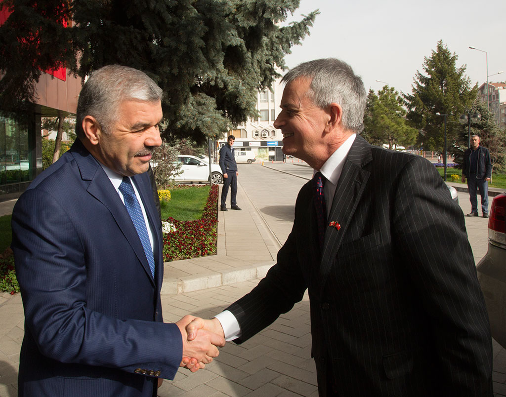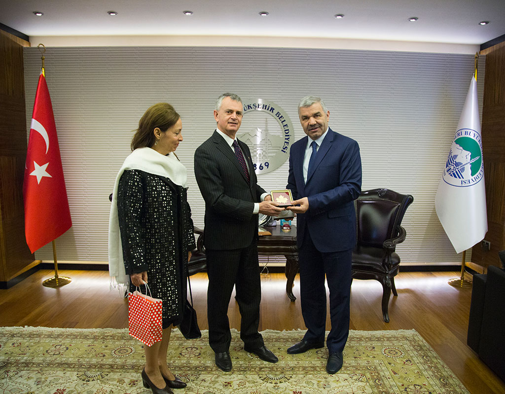 Kanada’nın Ankara Büyükelçisi Christhopher John Cooter ve eşi Karen Blumenschein, Büyükşehir Belediye Başkanı Mustafa Çelik’i ziyaret etti. Konuk Büyükelçi ile verimli bir görüşme yapan Başkan Çelik, yatırım davetinde bulunarak ekonomik ilişkilerin daha kalıcı hale gelebilmesi için uygun yatırım alanları olduğunu söyledi. Büyükşehir Belediye Başkanı Mustafa Çelik, Kanada Büyükelçisi Christhopher John Cooter’a Kayseri ile ilgili bilgiler verdi. Başkan Çelik, Kayseri’nin çok önemli bir tarih, kültür, sanayi, turizm ve sağlık şehri olduğunu belirtti. Kayseri’de olmaktan mutluluk duyduğunu ifade eden Büyükelçi Christhopher John Cooter da bu yıl Kanada ve Türkiye’nin diplomatik ilişkilerinin 75. yıl dönümü olduğunu hatırlattı ve bu ilişkileri daha da geliştirmek istediklerini söyledi. Ankara ve İstanbul dışındaki Kayseri gibi dinamik şehirleri de ziyaret etmek istediğini ifade eden Konuk Büyükelçi, “Kayseri’de yatırımlarımız artacak. Söylediğiniz üzere burası bir sağlık şehri ve biz de sağlıkla alakalı güzel bir müzeyi ziyaret ettik. Kanada da sağlık sektöründe öncüdür. Birlikte çalışabiliriz. Eğitim konusunda da çok iyiyiz. Sizin de çok iyi 3 üniversiteniz var. Öğrenci değişim programlarıyla kaynaklar oluşturabiliriz. Aynı şekilde turist değişimleriyle Kanada’dan buraya buradan Kanada’ya çeşitli turizm aktiviteleri yapabiliriz. Kanadalı iş adamları ya da iş hayatı Türkiye’de pek aktif değil. Şehrinizde özellikle bu ilişkileri daha da yükseltmek istiyoruz. Kayseri tarihi ve güzel bir şehir. Bu şehirde iş birliği yapabiliriz. Aynı zamanda bizler tarımda da çok iyiyiz. Sizlerle hayvancılık konusunda da ciddi çalışmalar yapabiliriz. Misafirperverliğiniz için çok teşekkür ederiz. Kanadalılara da buraya geldikleri zaman Erciyes Dağı’na gitmelerini özellikle söyleyeceğiz. Bugün biz de gideceğiz” dedi. “TARIM VE HAYVANCILIKTA İŞBİRLİĞİ YAPILABİLİR” Ekonomik ilişkilerin daha kalıcı hale gelmesi için Kayseri’de önemli sektörlerin var olduğunu ifade eden Büyükşehir Belediye Başkanı Mustafa Çelik de, “Burada Kanadalı bir firmanın maden yatırımları olduğunu biliyorum. Süreli bir yatırım. Rezerv bitene kadar çalışılacak, ondan sonra bitecek bir yatırım yapıldı. Ama hayvancılık konusunda yapılacak bir yatırım uzun yıllar devam edebilecek bir yatırım. Özellikle Kayseri sucuk ve pastırma imalatından dolayı et ve et ürünlerinin merkezi durumunda. Dolayısıyla burada kurulacak hayvancılık tesisi çok ekonomik ve kârlı bir yatırım olacaktır. Bu konuda biz de yerel yöneticiler olarak gereken desteği vermeye hazırız. Hayvancılığın yanı sıra başka sektörlerde de kalıcı yatırımlar yapılabilir. Kamuoyunda maden yatırımları çok sempatik gözükmüyor. Bunu tolere etmek için kalıcı yatırımlar yapılabilir. Yahyalı ve Develi bölgesinde tarım ve besicilik için çok uygun alanlar var. Dolayısıyla sizdeki yatırımcıları bu alanlarda yatırıma davet ediyoruz” diye konuştu. Ziyarette karşılıklı hediyeler de takdim edildi.