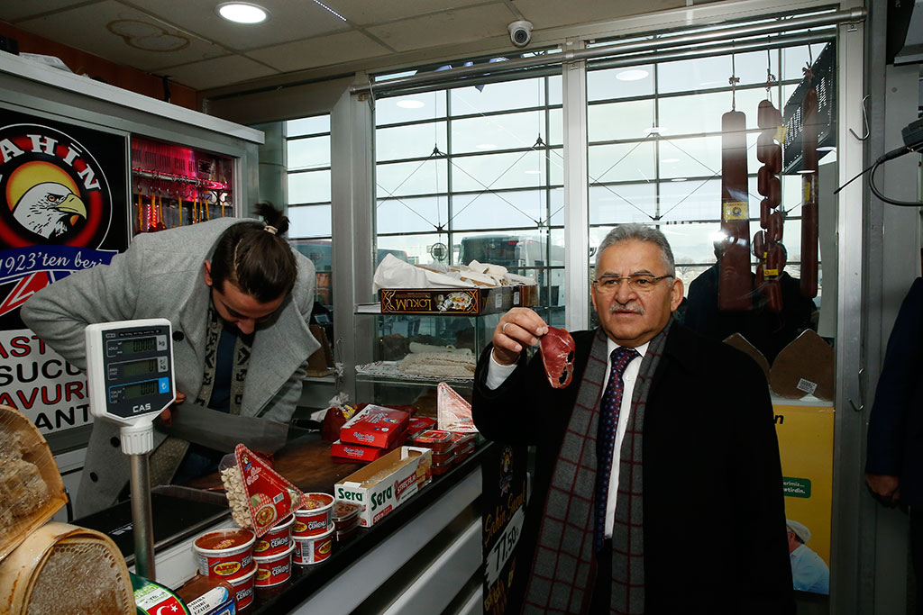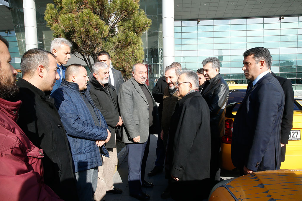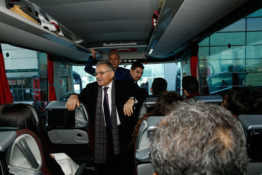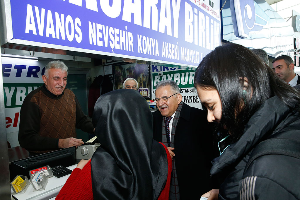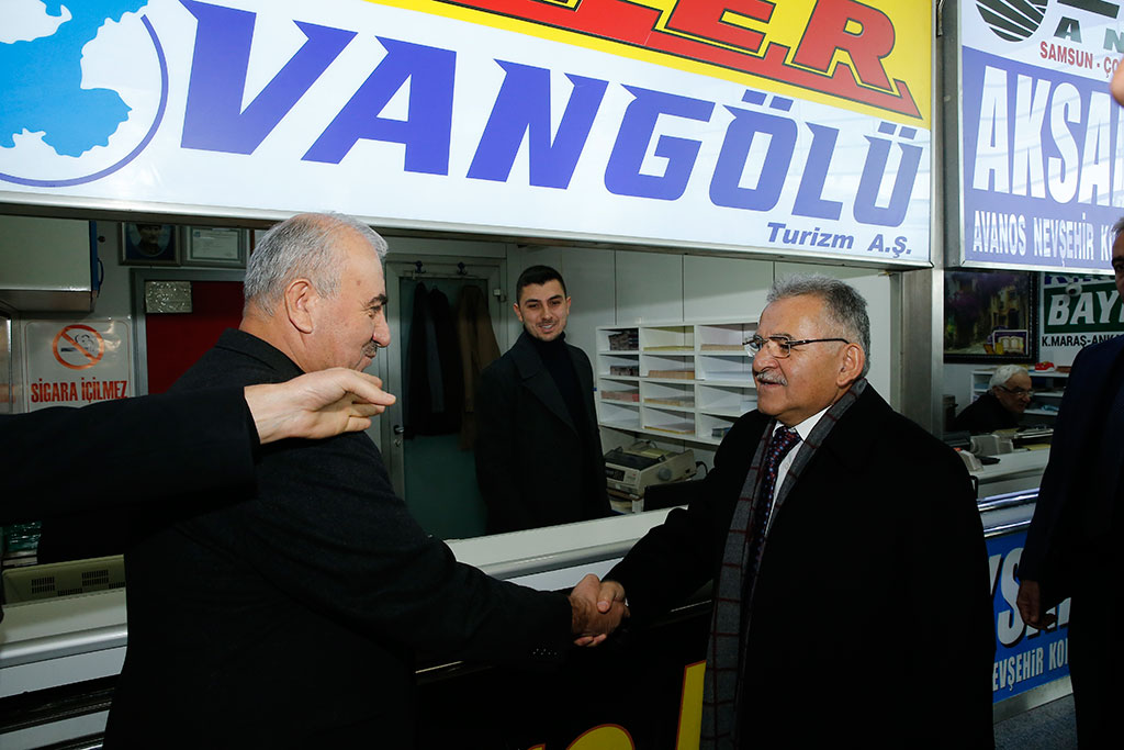 Kayseri Büyükşehir Belediye Başkanı Dr. Memduh Büyükkılıç, Şehirlerarası Otobüs Terminali’ni ziyaret etti. Otobüs firmalarının çalışanları ve esnaflarla görüşen Başkan Memduh Büyükkılıç, yola çıkmak üzere olan otobüslere de binerek yolculara “İyi Yolculuklar” dileklerinde bulundu. Büyükşehir Belediye Başkanı Dr. Memduh Büyükkılıç, Şehir Terminali’nde incelemelerde bulundu. Terminal ziyaretinde, otobüs firmalarının yazıhanelerini tek tek gezerek “Hayırlı İşler” temennisinde bulunan ve firma çalışanlarıyla sohbet eden Başkan Büyükkılıç, terminalle ilgili görüş ve önerilerini de sordu. Başkan Memduh Büyükkılıç, terminal içerisindeki esnafları da ziyaret etti. Esnaflarla sohbet eden Başkan Memduh Büyükkılıç, pastırmacıları ziyaretinde Kayseri pastırmasının önemini bir kez daha vurguladı. Büyükşehir Belediye Başkanı Büyükkılıç, Terminal ziyaretinde peronlarda hareket saatini bekleyen otobüslere de bindi. “Hayırlı Yolculuklar” temennisinde bulunan Başkan Memduh Büyükkılıç, yolcuların terminalle ilgili görüşlerini de aldı. Büyükşehir Belediye Başkanı Memduh Büyükkılıç, terminaldeki ziyaret ve incelemelerini Terminal Taksi esnafını ziyaret ederek tamamladı.