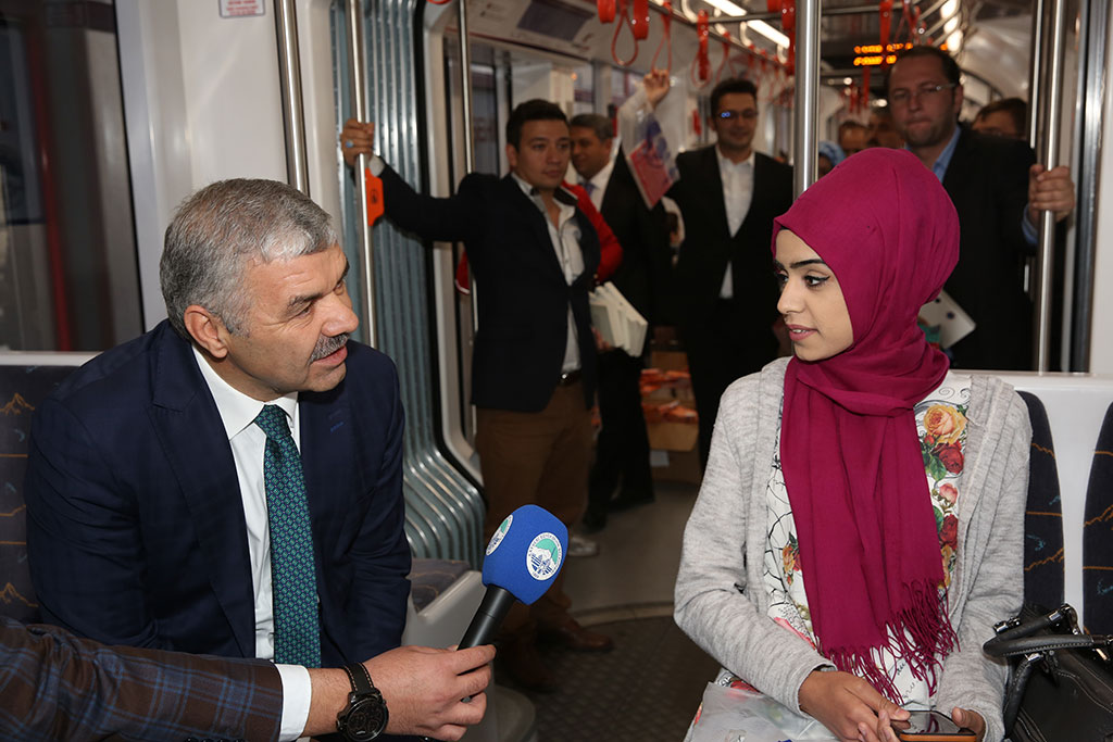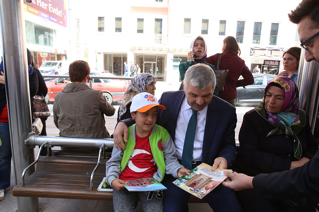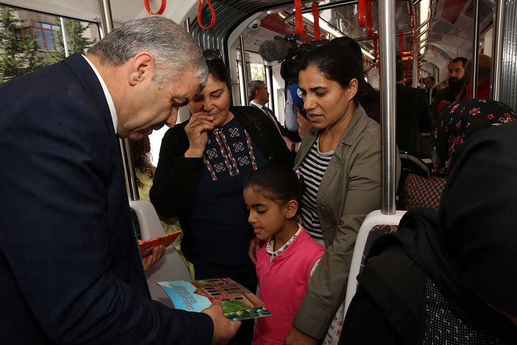 Büyükşehir Belediyesi tarafından 14-22 Ekim tarihleri arasında yapılacak olan 1. Kayseri Kitap Fuarı için tramvaylarda vatandaşlara kitap dağıtımı yapıldı. Büyükşehir Belediye Başkanı Mustafa Çelik de tramvaya binerek güzergah boyunca vatandaşları özel olarak Kitap Fuarı’na davet etti. Başkan Çelik, “Okuyan Şehir” için destek istedi. Büyükşehir Belediyesi’nin Kayseri Dünya Ticaret Merkezi’nde yapacağı Kitap Fuarı öncesi tramvaylarda tanıtım yapıldı. Gece boyunca tüm araçlara kitaplar ve fuarla ilgili kitapçıklar asıldı. Sabahın erken saatlerinden itibaren tramvaylara binen yolcuları kitaplar karşıladı. Yolcular okullarına ya da iş yerlerine dağıtılan kitapları okuyarak gittiler. Gün boyunca Kitap Fuarı ile ilgili tramvaylarda yapılan bilgilendirmelere Büyükşehir Belediye Başkanı Mustafa Çelik de aktif olarak katıldı. Düvenönü Durağı’na giden Başkan Çelik, burada yolcularla sohbet ederek bir süre tramvay bekledi ve yolculara Kitap Fuarı için hazırlanmış çeşitli hediyeler verdi. Düvenönü durağında Talas tramvayına binen Büyükşehir Belediye Başkanı Çelik, yolcuları kitaplarla karşıladı. Vatandaşlar asılı poşetlerdeki kitapları ve bilgilendirme kitapçıklarını alarak Başkan çelik ile sohbet ettiler. Tüm yolcuları tek tek Kitap Fuarı’na davet eden Başkan çelik, fuara çok önemli yazarların katılacağını kaydetti. Kayseri’yi okuyan şehir yapmak istediklerini ifade ederek herkesten bu hedefe ulaşılması için destek isteyen Başkan Çelik, Kitap Fuarı’nın bu amaç için yapılan önemli bir çalışma olduğunu dile getirdi. Başkan Mustafa Çelik, Erciyes Üniversitesi durağına kadar tramvayda yolculuk etti ve güzergah boyunca yolcularla sohbet etti. Erciyes Üniversitesi durağında inen Başkan Çelik, bir süre de üniversite içindeki öğrencilere kitap ve fuarda kullanabilecekleri indirim kuponlarını vererek Kitap Fuarı’na davet etti.