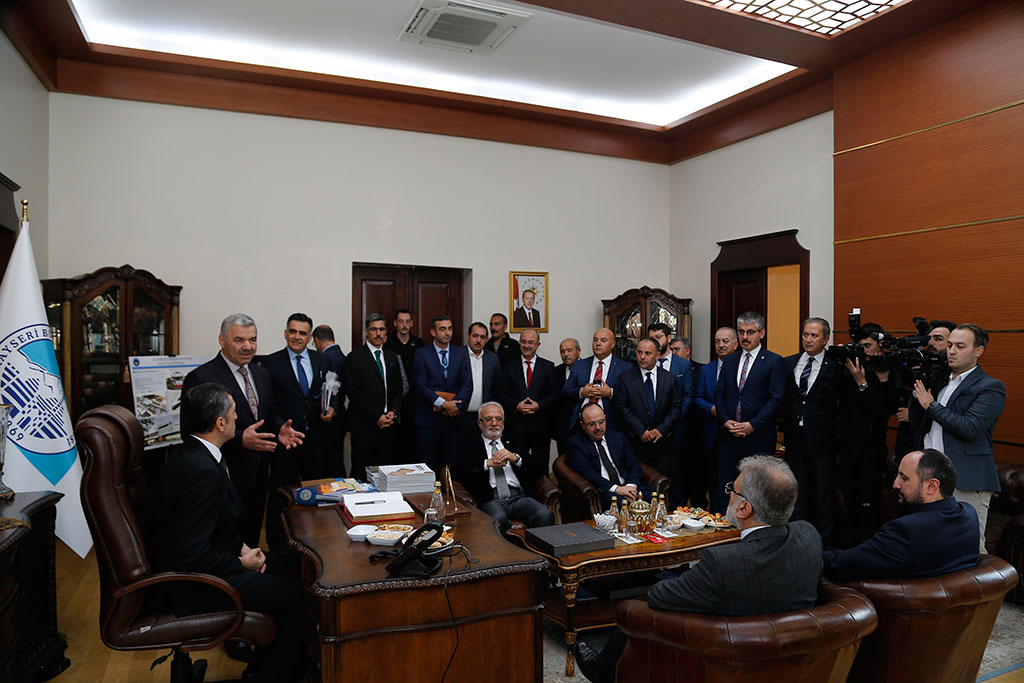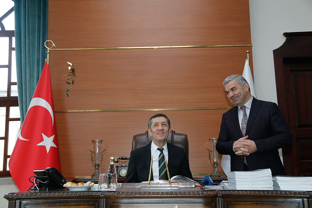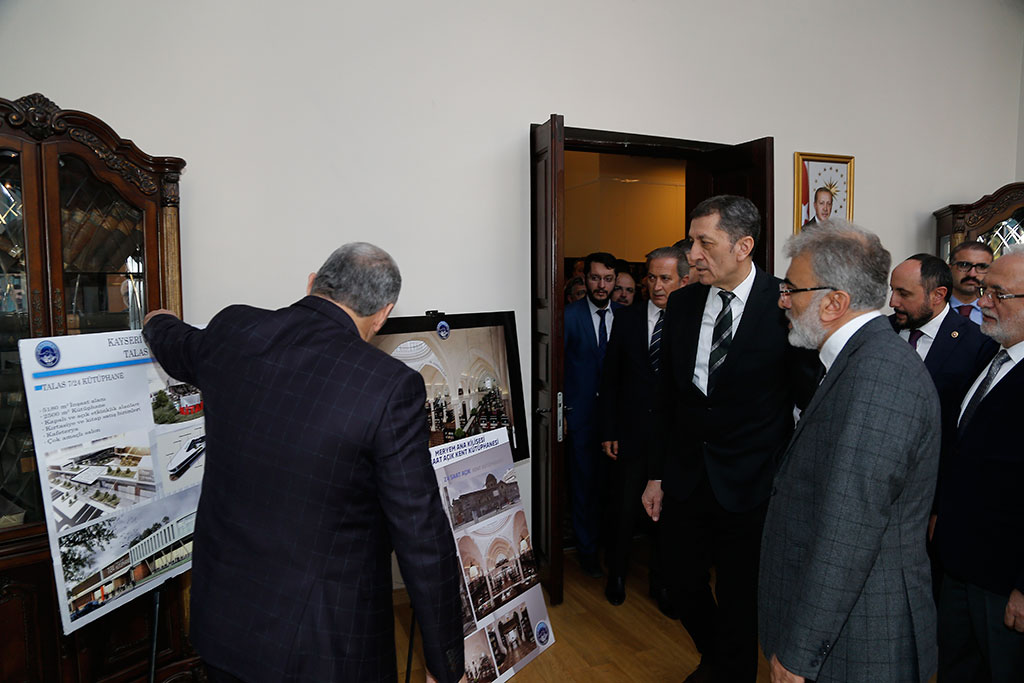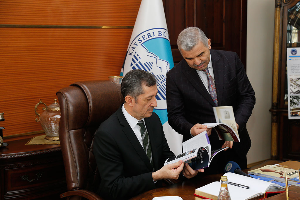 Kayseri programı kapsamında eğitim tesislerinin temel atma ve açılış törenlerine katılan ve ilimizdeki öğretmenlerle bir araya gelen Milli Eğitim Bakanı Ziya Selçuk, Büyükşehir Belediyesi’nin kültür sanat alanında yapmış olduğu çalışmaları bir cümleyle değerlendirdi. Büyükşehir Belediye Başkanı Mustafa Çelik’ten kültür sanat alanında yapılan çalışmaları dinleyen Bakan Selçuk, “Başkanım bu alanda sanatını konuşturmuş” ifadelerini kullandı. Milli Eğitim Bakanı Ziya Selçuk, Kayseri programı kapsamında Büyükşehir Belediyesi’nin kullanımında olan Kayseri Lisesi’nin eski tarihi binasını ziyaret etti. Bakan Selçuk’a ziyaretinde Vali Süleyman Kamçı, AK Parti Kayseri Milletvekilleri Taner Yıldız, Mustafa Elitaş ve İsmail Emrah Karayel ile bürokratlar da eşlik etti. Büyükşehir Belediye Başkanı Mustafa Çelik, burada Bakan Selçuk’a kültür sanat alanında yaptıkları çalışmalarla ilgili bilgiler verdi. Fiziki yatırımlar yaparken kültür sanat çalışmalarını ihmal etmediklerini ifade eden Başkan Çelik, şehrin kültür hayatına önemli katkılar sunan “Şehir Kültür Sanat” ve “Düşünen Şehir” dergilerini gösterdi. Büyükşehir Stratejik Araştırma Merkezi kurduklarını ve bu merkez bünyesinde Şehir Akademisi ve Film Akademisini oluşturduklarını ifade ederek bu kapsamdaki çalışmalardan bahseden Başkan Çelik, geçen ay yapılan Kitap Fuarı’na da değinerek “Türkiye’nin en iyi kitap fuarını biz yapıyoruz. Fuarımıza 670 bin ziyaretçi geldi” dedi. Yapılanları bir cümle ile değerlendiren Milli Eğitim Bakanı Ziya Selçuk, “Başkanım sanat okulu kökenli ve sanatını burada konuşturmuş” dedi. AK Parti Kayseri Milletvekili Taner Yıldız da “Kültür sanat alanında biraz geriydik. Bunu kabul etmek lazım; ama Başkanımız bu konuda çok ciddi mesafe kat etti” diye konuştu. Başkan Mustafa Çelik, Bakan Selçuk’a ziyaretinde Büyükşehir Belediyesi’nin bastırdığı “Medeniyetler Şehri Kayseri” kitabını da takdim etti. Başkan Çelik, kütüphane yatırımları hakkında da bilgi verdi. Kayseri’ye 800 kişilik merkez kütüphane olmak üzere modern kütüphaneler kazandırdıklarını vurgulayan Başkan Çelik, Meryem Ana Kilisesi binasında ve Talas’ta yapacakları 24 saat hizmet verecek Türkiye’ye örnek kütüphaneler hakkında da açıklamalarda bulundu. Milli Eğitim Bakanı Ziya Selçuk, ziyaretinde Büyükşehir Belediyesi’nin anı defterini de imzalayarak duygularını dile getirdi.