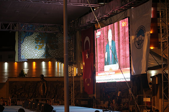 Daha sonra Büyükşehir Belediyesi'nce meydana kurulan dev ekrandan Beştepe'de şehitlerimiz için yapılan programda Cumhurbaşkanımız Recep Tayyip Erdoğan'ın konuşması takip edildi. Konuşmayı, Vali Süleyman Kamçı ve eşi, Başkan Mustafa Çelik ve eşi ile Kayseri Jandarma Bölge Komutanı Tuğgeneral Uğur Özcan da halkla birlikte izledi.