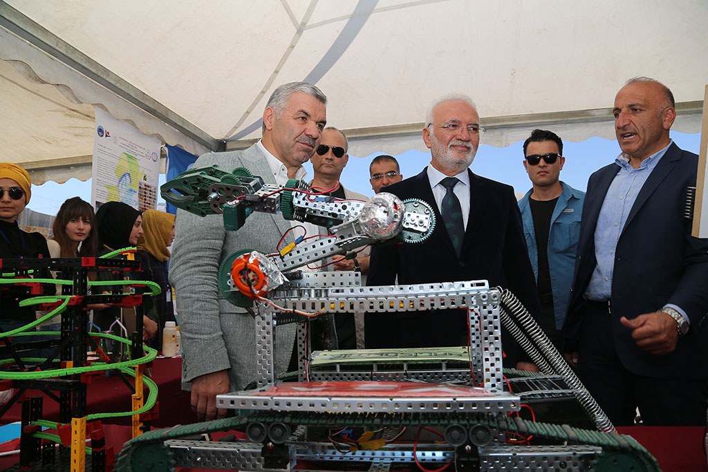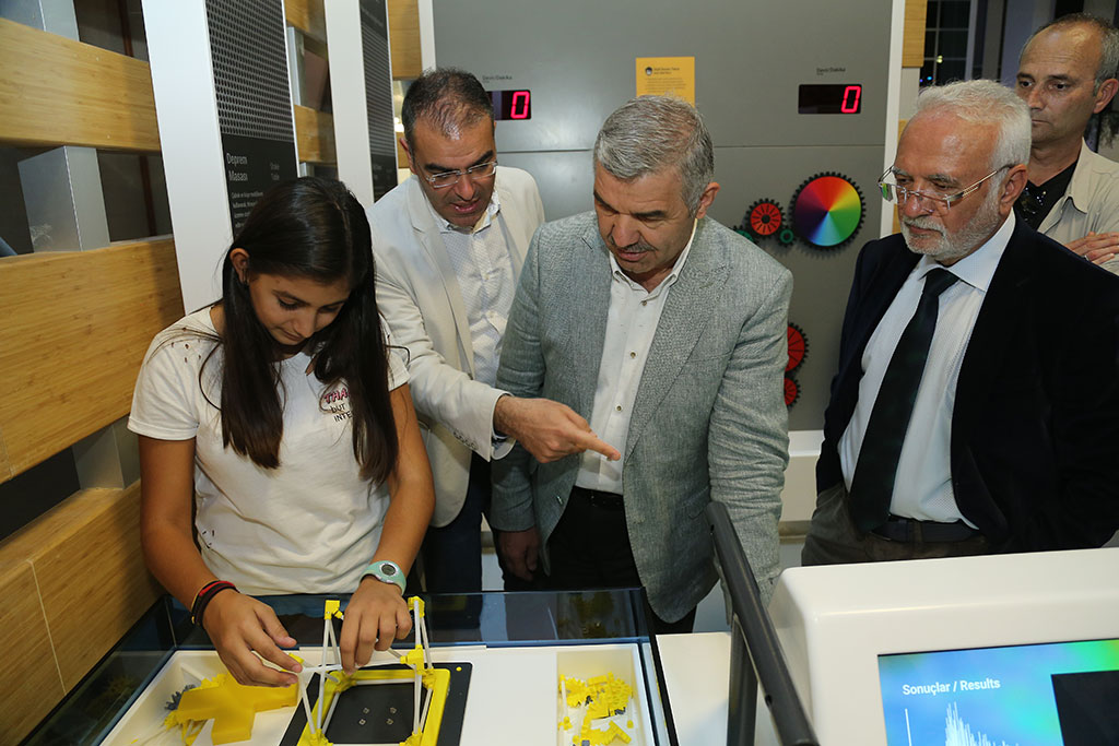 Kayseri Büyükşehir Belediyesi’nin ev sahipliğinde Kayseri Bilim Merkezi tarafından düzenlenen Kayseri Bilim Şenliği halkın yoğun ilgisi ve katılımlarıyla devam ediyor. Büyükşehir Belediye Başkanı Mustafa Çelik de TBMM Sanayi, Ticaret, Enerji, Tabii Kaynaklar, Bilgi ve Teknoloji Komisyonu Başkanı ve AK Parti Kayseri Milletvekili Mustafa Elitaş ile birlikte Kayseri Bilim Merkezi’ni ve şenlik alanındaki stantlarda öğrencilerin geliştirdikleri teknolojik çalışmaları inceledi, güneş enerjisi ile çalışan maket araçların yarışlarını izledi. Gençler için yapılan projelere önem veren Büyükşehir Belediye Başkanı Mustafa Çelik, geleceğin teminatı olarak gördüğü gençlere dönük her etkinliğe katılmaya özen gösteriyor. Büyükşehir Belediye Başkanı Mustafa Çelik, Anadolu Harikalar Diyarı içerisindeki Bilim Merkezi’nin bahçesinde kurulan Bilim Şenliği etkinlik alanını TBMM Sanayi, Ticaret, Enerji, Tabii Kaynaklar, Bilgi ve Teknoloji Komisyonu Başkanı ve AK Parti Kayseri Milletvekili Mustafa Elitaş ile birlikte gezdi. Bütün standları tek tek gezen Başkan Çelik ve Milletvekili Elitaş öğrencilerin yapmış oldukları çalışmalar hakkında bilgiler aldı. Güneş enerjisi ile çalışan maket araçların yarışlarını da izleyen Çelik ve Elitaş, öğrencileri yapmış oldukları çalışmalardan dolayı tebrik etti. Şenlik alanının ardından Bilim Merkezi’ni gezen Elitaş ile birlikte gezen Başkan Çelik, buluşları ve teknolojik çalışmaları yerinde inceleyerek, öğrencilerle sohbet etti.