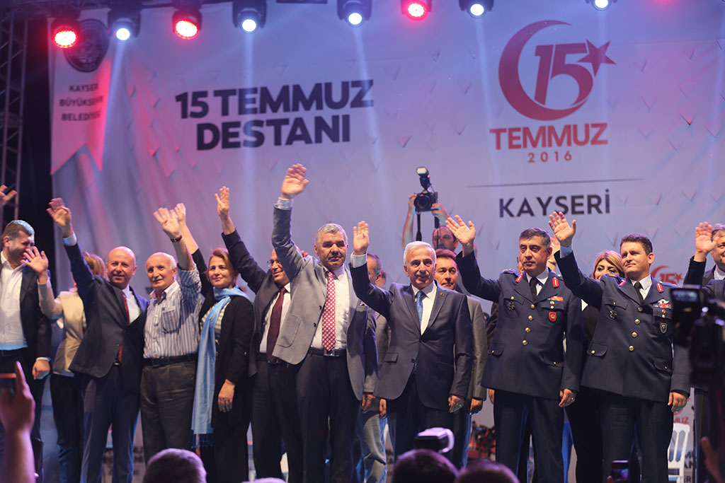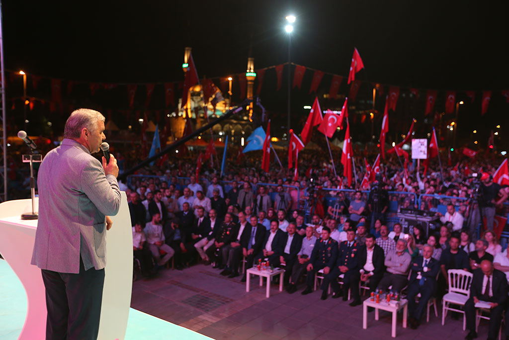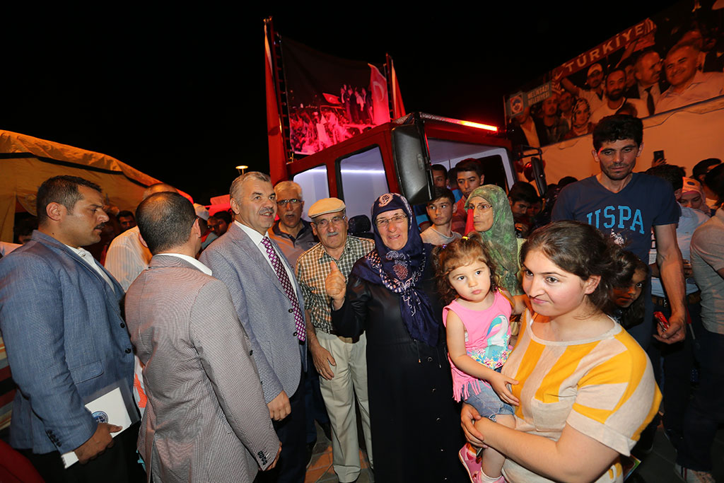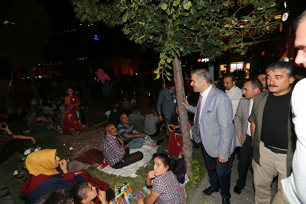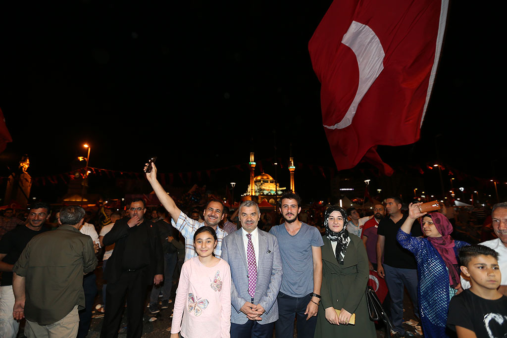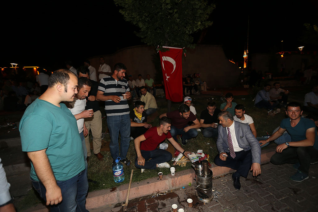 15 Temmuz’un yıldönümünde Kayseri yine meydanlara aktı. Cumhuriyet Meydanı’nda yüz binler 15 Temmuz Şehitler ve Demokrasi Günü nedeniyle bir araya geldi. Büyükşehir Belediye Başkanı Mustafa Çelik, sabah namazına kadar Cumhuriyet Meydanı’nda vatandaşlarla birlikteydi. 15 Temmuz’da bu milletin gösterdiği kahramanlığı vurgulayan ve şehitlerimizi anan Başkan Çelik, “Her şehidimiz ve gazimiz bu ülkenin göğsünde parıldayan birer şeref madalyasıdır” dedi. Büyükşehir Belediye Başkanı Mustafa Çelik, 15 Temmuz’un yıldönümünde düzenlenen etkinliklerin ilk dakikalarından sabah namazına kadar Kayseri halkıyla birlikte Cumhuriyet Meydanı’ndaydı. Başkan Çelik, etkinliklerin ilk dakikalarında Cumhuriyet Meydanı’nı gezerek 15 Temmuz ruhu ile meydana gelen vatandaşlarla görüştü. Halkla selamlaşan, fotoğraflar çektiren Başkan Çelik, gecede Büyükşehir Belediyesi’nin ikramlarından olan döner ekmek dağıttı. 15 Temmuz etkinlikleri İl Müftüsü Şahin Güven’in yaptırdığı dua ile başladı. Etkinliklere Büyükşehir Belediye Başkanı Mustafa Çelik’in yanı sıra Vali Süleyman Kamçı, Garnizon Komutanı Tuğgeneral Ercan Teke, 12'nci Hava Ulaştırma Ana Üs Komutanı Tuğgeneral Selçuk Aygün, siyasi parti il başkanları, üniversite rektörler, adli ve idari yargı temsilcileri, ilçe belediye başkanları, bürokratlar, siyasiler, oda ve dernek başkanları katıldı. Yöneticiler, meydanı dolduran yüz binlerle birlikte şehitlerimiz, bu vatanın bölünmez bütünlüğü, milletimizin birlik ve beraberliği için dualar ettiler. Vali Süleyman Kamçı’nın konuşmasının ardından, İstanbul’a canlı olarak bağlanıldı ve Cumhurbaşkanımız Recep Tayyip Erdoğan’ın yaptığı konuşma Kayseri’de de yüz binlere izletildi. Gecede bir konuşma yapan Büyükşehir Belediye Başkanı Mustafa Çelik, sözlerine “Demokrasi Kahramanları, Milli İradenin yılmaz neferleri, Bu vatanı kendini bilmez densizlere, ihanet örgütlerine, bir takım şer güçlerin uşaklarına, terör odaklarına, kendi milletine kurşun sıkan ve sıktıran alçaklara asla ve asla teslim etmemeye yemin etmiş vatan, millet, bayrak ve ezan sevdalıları, farklı siyasi görüşler taşımalarına rağmen Şehrimizin dört bir yanından Cumhuriyet Meydanı’na gelen Aziz Kayserililer” diye hitap ederek başladı. “KAYSERİ FARKINI GÖSTERDİ” Kayseri’nin bir yıl önce olduğu gibi yine farkını gösterdiğini ifade eden Başkan Çelik, “Böylesi aziz bir topluluğa hitap etmekten, böylesi kahraman bir milletin ferdi olmaktan, böylesi bir Kayseri’de yaşamaktan ve bu meydanı dolduran vatan, millet sevdalılarına hizmet etmekten onur duyuyorum, gurur duyuyorum” dedi. 15 Temmuz 2016’da, tarihimizde görmediğimiz bir hıyanetle karşılaştıĞIMIZI VURGULAYAN Başkan Mustafa Çelik sözlerini şöyle sürdürdü: “Vatansız, milletsiz, densiz bir alçak, bir takım şer güçlerin de desteğiyle aziz vatanımızı karıştırmaya kalktı. Bu vatanın evlatlarını zehirleyerek bu milletle karşı karşıya getirdi. Yılanın başı, terörün başı, hıyanetin başı olan bu iblis yıllarca hizmet sevdalıları yetiştiriyorum diyerek bu milleti aldattı. 15 Temmuz’da gördük ki, milletine silah doğrultan hainler yetiştirmiş. Gördük ki, milletin meclisini bombalayan, halkın üzerine çekinmeden tank süren alçaklar yetiştirmiş. Gördük ki, bu milletin koynunda yaşayan yılanlar yetiştirmiş. Bu hainlere her türlü alçaklığı öğretmiş. Ama Türk Milletinin nasıl aziz bir millet olduğunu öğretememiş. 15 Temmuz ve sonrasında öğrendiler.” “ANADOLU, MAZLUMLARIN MERHAMET LİMANIDIR” 15 Temmuz’da 40 yıllık bir hıyanet şebekesinin çökertildiğini dile getiren Büyükşehir Belediye Başkanı Çelik, “Onlar bize, evlatlarımıza, devletimize, vicdanımıza, tevhidin kendisi olan Kuranı Kerim’e ihanet ettiler. FETÖ ve uşakları şimdi mahkeme salonlarında adam gibi kendilerini savunacaklarına kıvırtarak yalan söylüyorlar. Artık bu milleti kandıramayacaksınız, aldatamayacaksınız. Bu millet ne mal olduğunuzu öğrendi” diye konuştu. Konuşmasında ülkemizin önemini de vurgulayan Başkan Mustafa Çelik, sözlerine şöyle devam etti: “Bir yıl önce bu meydanlarda omuz omuza verdik. Görüş farklılıklarımızı bir kenara bıraktık ve birlik olduk. Tanklarıın toplarını iman dolu göğsümüzde söndürdük. Tüm dünyaya zulme nasıl durulduğunu gösterdik. Milletimiz 15 Temmuz gecesini destansı dirilişe döndürdü. Bu milletin kıblesi Kabe’dir. Bu ülke açların Halil İbrahim Sofrasıdır. İnsanımız, üşüyen bedenlerin saadet güneşi, Anadolu ise mazlumların merhamet limanıdır. O zulmün maşası olan hainler bu limanı yıkmak, bu sofrayı dağıtmak, bu güneşi söndürmek istediler. Ama onların hesabından daha büyük bir hesap vardı, o da Rabbimin hesabı. Evet, şehitlerimiz ve gazilerimiz var; ama her şehidimiz ve gazimiz bu ülkenin göğsünde parıldayan birer şeref madalyası oldu. Bugün yine tüm meydanlar tıklım tıklım doldu. Bu ruh bir diriliş ruhudur. Bu ruh yüzyılın ihanetine karşı kazanılmış yüzyılın zafer ruhudur.” Büyükşehir Belediye Başkanı Çelik’in konuşmasının ardından AK Parti ve MHP İl Başkanları ile bazı konuşmacılar halka hitap etti. Gecede ayrıca ağıtlar seslendirildi, geçen yıl 15 Temmuz gecesi olduğu gibi salalar verildi. Büyükşehir Belediye Başkanı Mustafa Çelik, konuşmaların ardından gecenin ilerleyen saatlerinde bir kez daha Cumhuriyet Meydanı’nın karış karış dolaştı. Başkan Çelik, vatandaşlarla tek tek ilgilendi, selam verdi, hatır sordu ve zaman zaman da onlarla oturup çay içti, sohbet etti. 15 Temmuz etkinlikleri sabah namazına kadar devam etti. Vali Süleyman Kamçı, Başkan Mustafa Çelik, komut