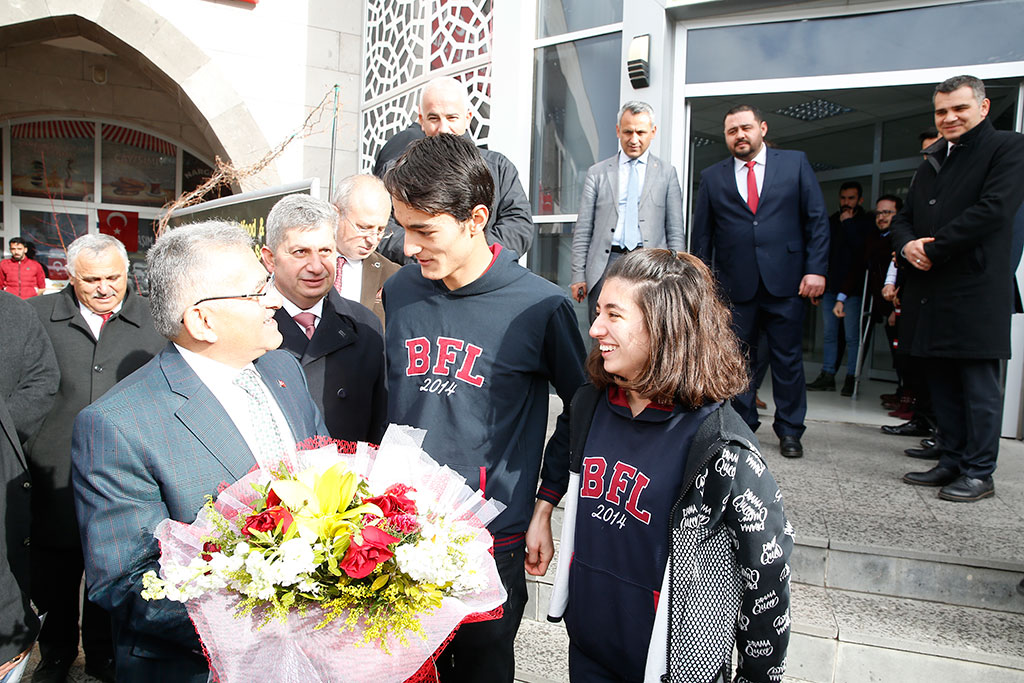 Kayseri Büyükşehir Belediye Başkanı Dr. Memduh Büyükkılıç, Bünyan Sosyal Yaşam Merkezi’nde öğrencilerle bir araya geldi. Bünyan İlçe Milli Eğitim Müdürlüğü tarafından düzenlenen lise son sınıf öğrencilerinin katıldığı Kariyer Günlerine iştirak eden Başkan Büyükkılıç, öğrencilere önemli tavsiyelerde bulundu. Başkan Memduh Büyükkılıç, Bünyan’da bazı ziyaret ve temaslarda da bulundu. Büyükşehir Belediye Başkanı Dr. Memduh Büyükkılıç, Bünyan Sosyal Yaşam Merkezi Konferans Salonu’nda alkışlarla karşılandı. Bünyan’daki lise son sınıf öğrencilerinin katılımıyla İlçe Milli Eğitim Müdürlüğü tarafından gerçekleştirilen Kariyer Günlerinin konuğu olan Başkan Memduh Büyükkılıç, katılan ilçe protokolüne ve Şehit Polis Cennet Yiğit’in babası Yahya Kemal Yiğit ile Annesi Huriye Yiğit’e teşekkür ederek tüm şehitlerimize rahmet dileklerinde bulundu. Öğrencilere ilk olarak Kayseri’nin tanıtım filmini izleten Başkan Memduh Büyükkılıç, Kayseri’nin mükemmel bir şehir olduğunu belirterek bu şehirde yaşayan herkesin aidiyet duygusunun güçlenmesini istedi. “GEÇMİŞTEN DERS ALIN GELECEĞE BAKIN” Konuşmasında geçmişten örnekler vererek ülkemizin ve toplumun geldiği noktayı ortaya koyan Başkan Memduh Büyükkılıç, “Bunları sizi geçmişe taşımak için değil geçmişten ders alarak bulunduğumuz noktanın kıymetini bilmeyi ve bulunduğumuz noktayı daha ilerilere taşıma yolunda gayret göstermenizi vurgulamak amacıyla söylüyorum” dedi. Öğrencilerden bulundukları yerin en başarılısı ve en çok hak edeni olmak için gayret göstermelerini isteyen Başkan Memduh Büyükkılıç, “Sıradan olmayacaksınız. Hangi alanı düşünüyorsunuz en başarılı olmak için gayret edeceksiniz. Sizler, bir yarışın içindesiniz. Eğitim olmazsa olmazınız; ama sosyal yönünüzü de göz ardı etmeyeceksiniz. Nitelikli eğitim almış ve bunun yanında spor, müzik gibi konularda kendisini geliştirmiş kişi başkasıyla bir olmaz” diye konuştu. “MÜSLÜMAN TÜRK MİLLETİNİN EVLADIYIZ” Kimsenin aleyhine konuşmadan daha fazla çalışılması gerektiğini de vurgulayan Büyükşehir Belediye Başkanı Büyükkılıç, “Başkalarının eksikliği bize bir şey kazandırmaz. Başarıdan başarıya koşmalıyız ki, başkaları bizi anlatmalı. Bunun için bulunduğunuz okulların ve imkanların kıymetini bilin” dedi. Ülkemizi her dönemde parçalamak isteyenlerin olduğunu da vurgulayan Başkan Büyükkılıç, sözlerini şöyle sürdürdü: “Bu ülkeyi parçalamak için bizi bölmeye çalışıyorlar. Biz sucu bucu değiliz. Biz Müslüman Türk Milletinin evladıyız. Farklı kesimler değişik argümanlarla karşınıza çıkabilir. Ne olursunuz oyunlara gelmeyin.” KAYSERİ’Yİ TANIYANLARA ANINDA BİSİKLET Büyükşehir Belediye Başkanı Dr. Memduh Büyükkılıç, Kariyer Günleri’nde öğrencilere de Kayseri ile ilgili çeşitli sorular yöneltti. Başkan Büyükkılıç, Makarr-ı Ulema ve Kültepe ile ilgili soruları bilen iki öğrenciye bisiklet sözü verdi ve daha toplantı bitmeden bisikletleri aldırarak öğrencilere hediye etti. Başkan Memduh Büyükkılıç, konferansı sırasında gençlerin sorularını ve taleplerini de cevaplandırdı. Başkan Büyükkılıç’a konferans sonrası Bünyan Halk Eğitim Merkezi öğrencilerinin kök boyadan dokudukları seccade hediye edildi. BÜNYAN’DA ZİYARETLERDE BULUNDU Büyükşehir Belediye Başkanı Dr. Memduh Büyükkılıç, Sosyal Yaşam Merkezi’ndeki konferansın ardından Bünyan Belediye Başkanı Özkan Altun ve AK Parti İlçe Başkanı Yıldıray Hakkı Koç ile birlikte AK Parti İlçe Başkanlığı’nı ziyaret etti. Ziyaretin ardından Kayseri ve Civarı Elektrik T.A.Ş.’nin Bünyan’daki santralini gezen Başkan Büyükkılıç, 1929 yılında ilk kez üretime geçen santralde incelemelerde bulundu. Başkan Memduh Büyükkılıç, Bünyan’da ayrıca öğle namazının ardından Bayramlı Camii’nde Müzeyyen Ünal’ın cenaze namazını kıldı.